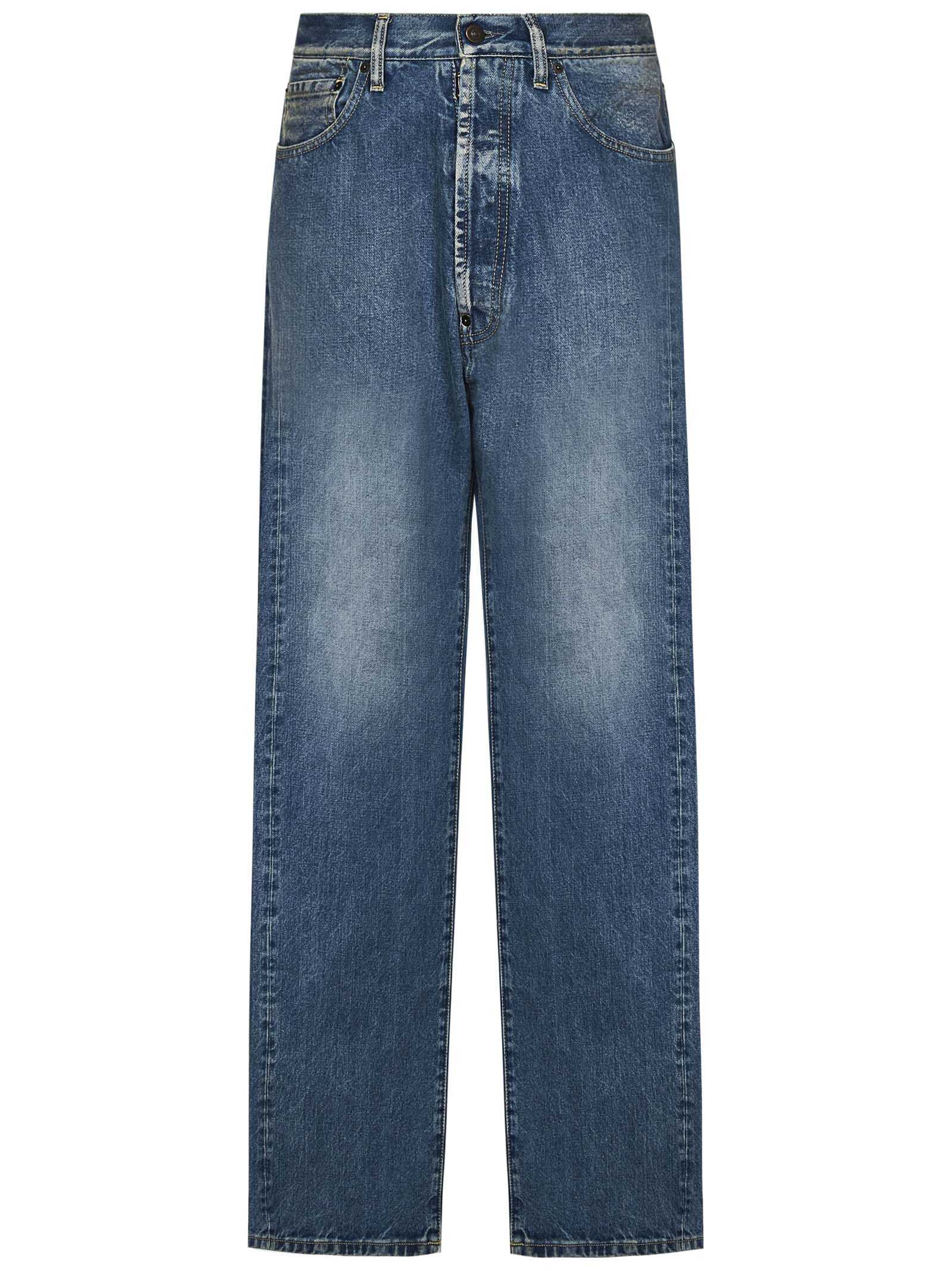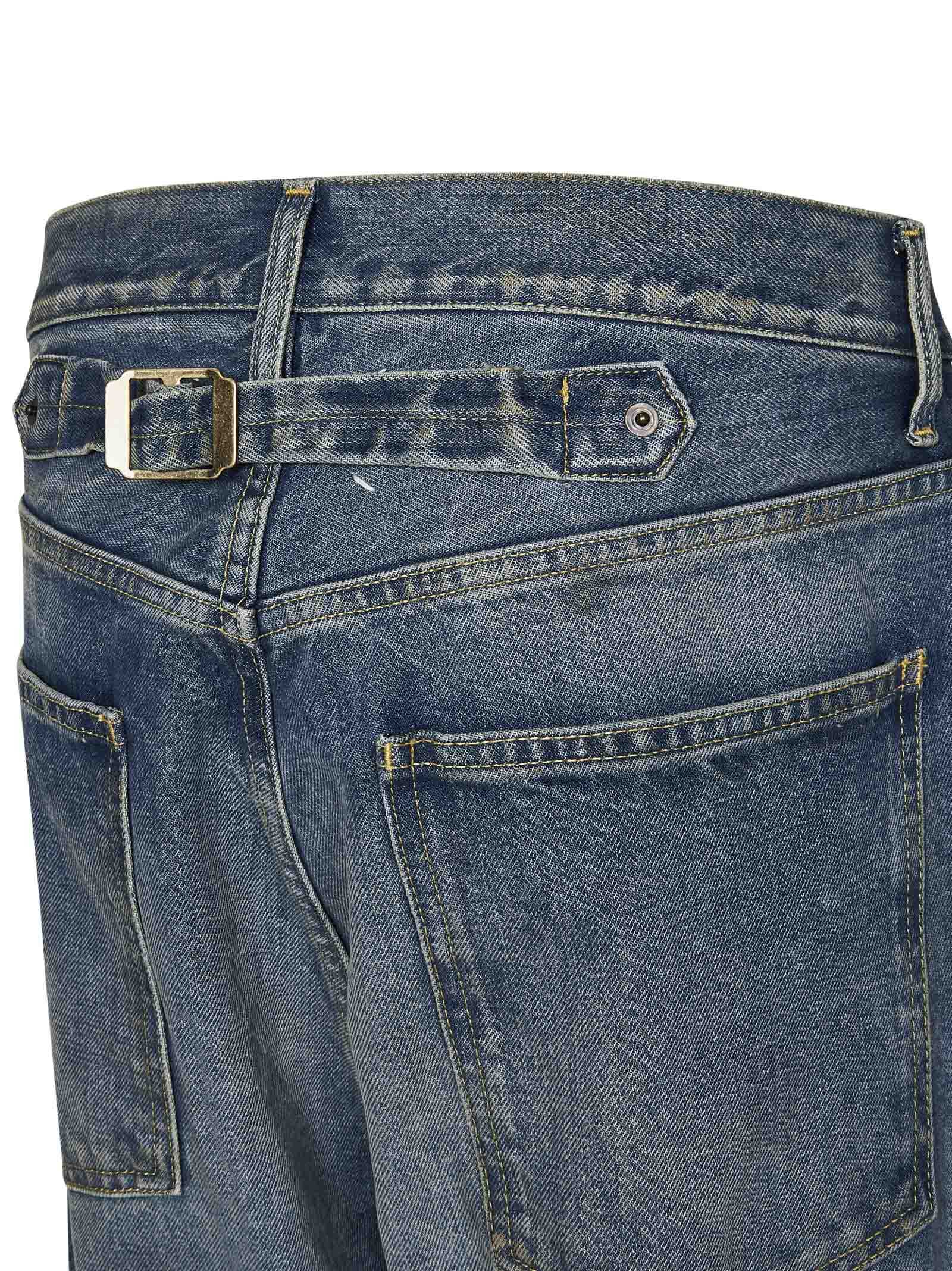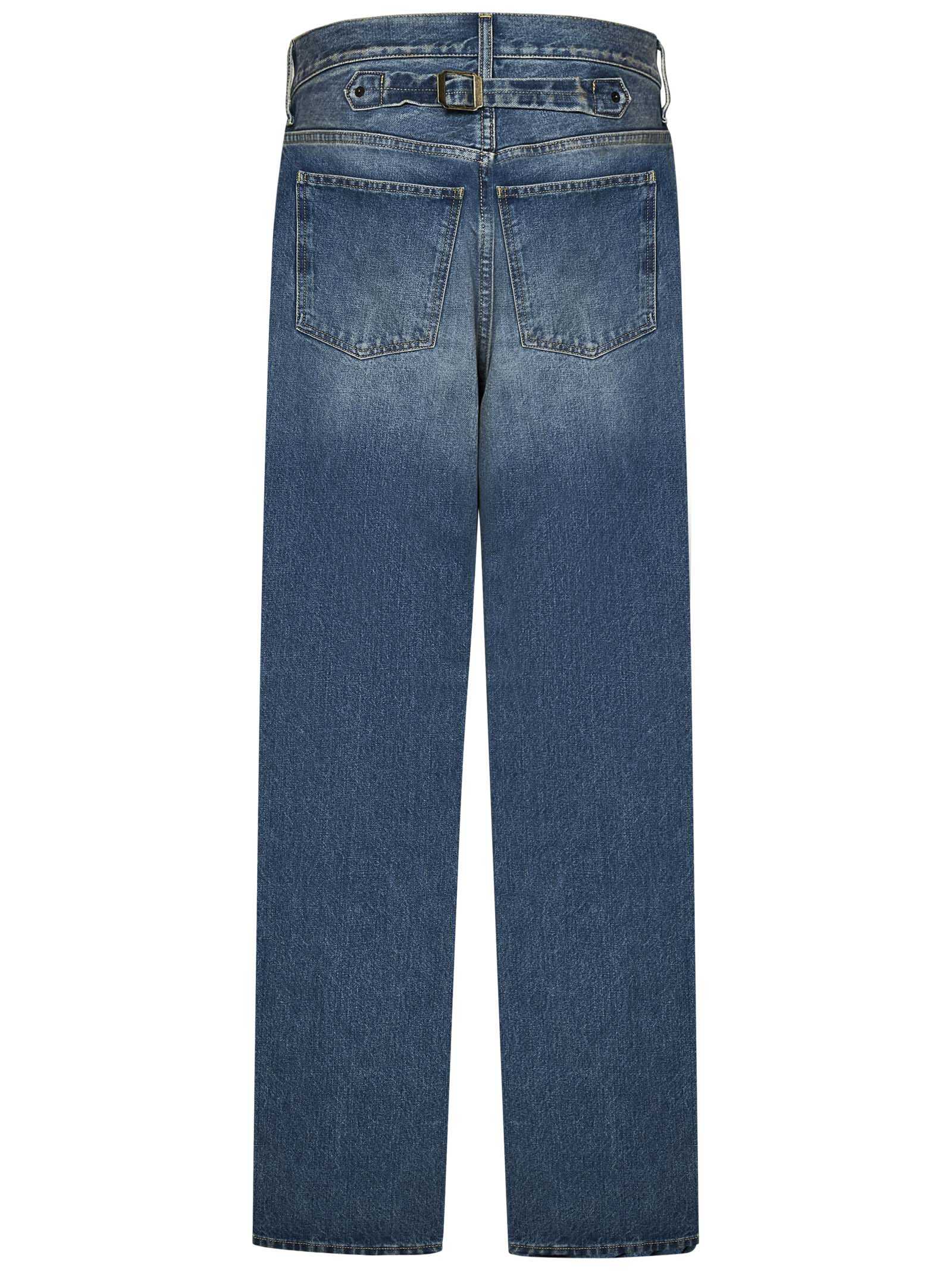 Straight leg jeans in 14oz Origin denim washed blue with hook and Four Stitches logo on the back.
