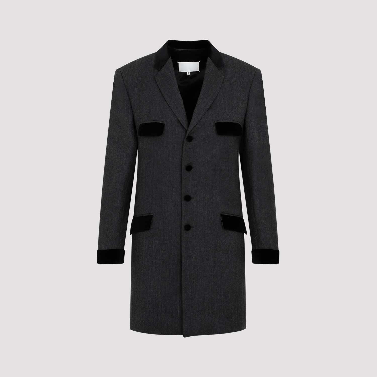 Stay stylish and warm with this MAISON MARGIELA grey wool jacket. Featuring a classic notched collar, long sleeves, and front button fastening, this jacket is both fashionable and functional. With side and chest pockets for convenience, and intricate stitching embellishment on the cuffs, this fully lined jacket is a must-have for any fashion-forward woman. Elevate your wardrobe with this chic and versatile piece from MAISON MARGIELA.