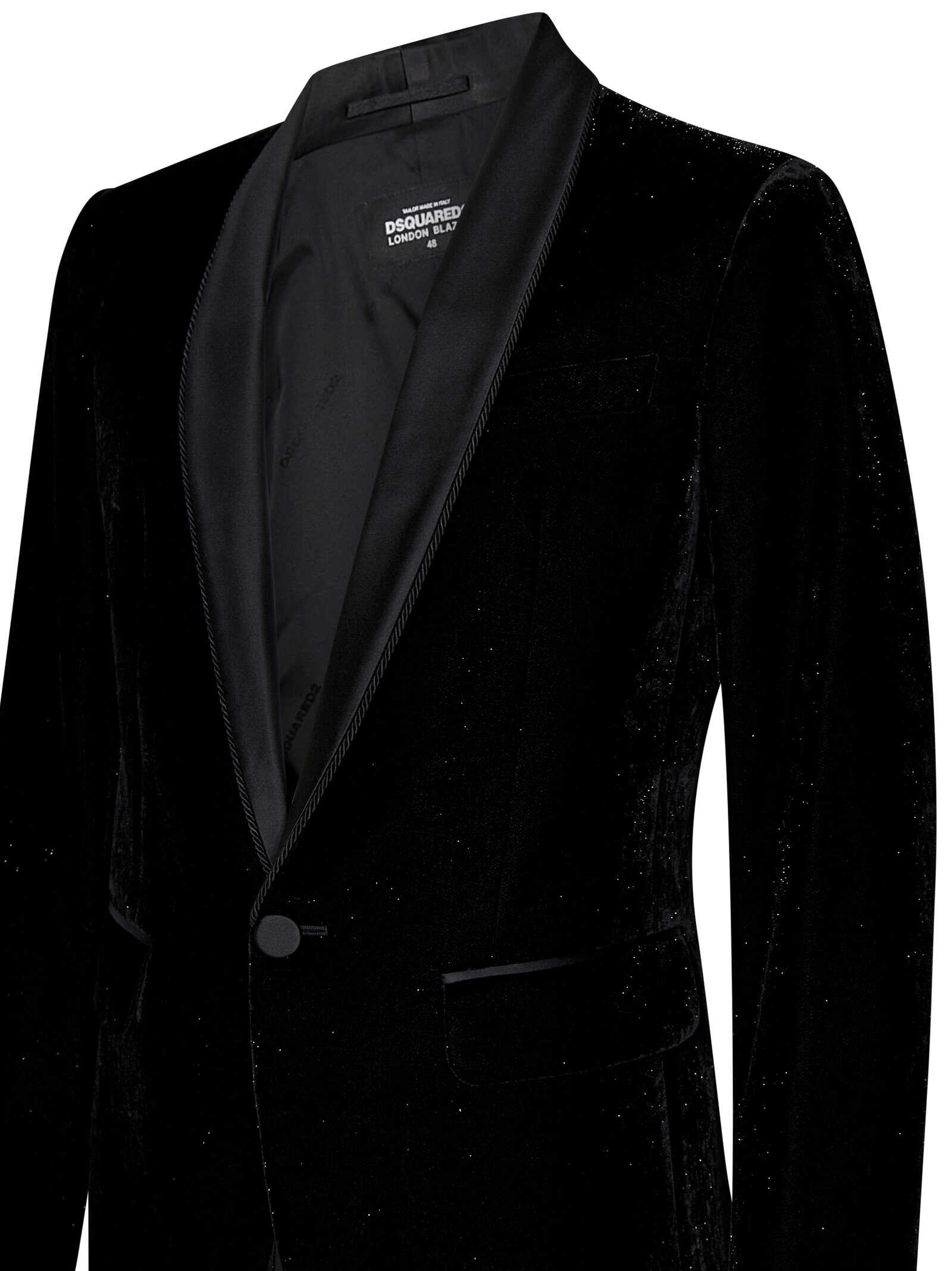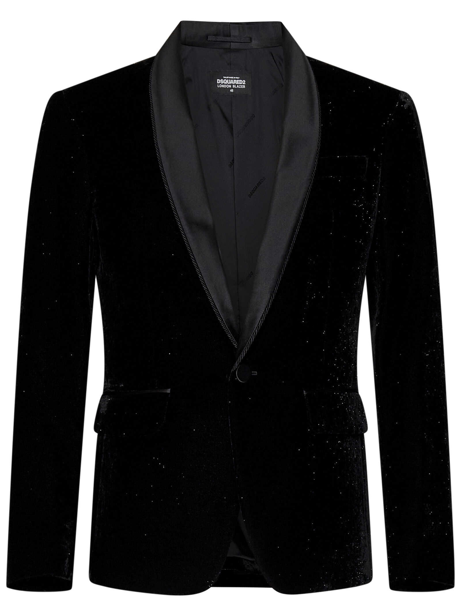 Single-breasted black smooth velvet tuxedo blazer with silk blend satin shawl lapel.