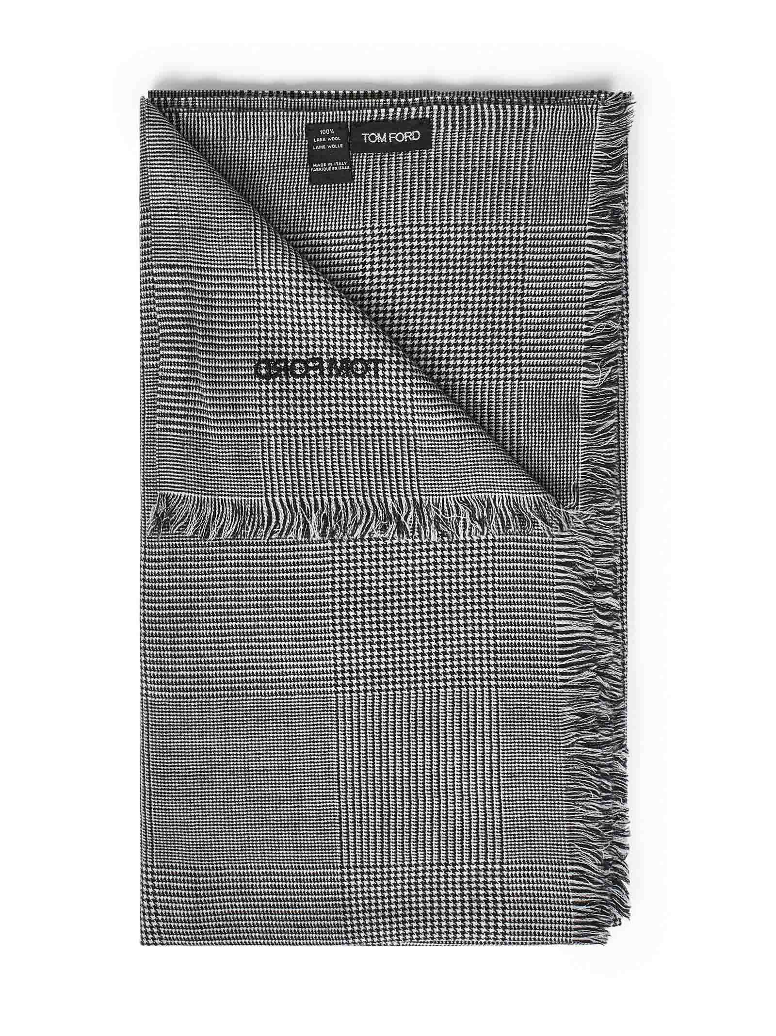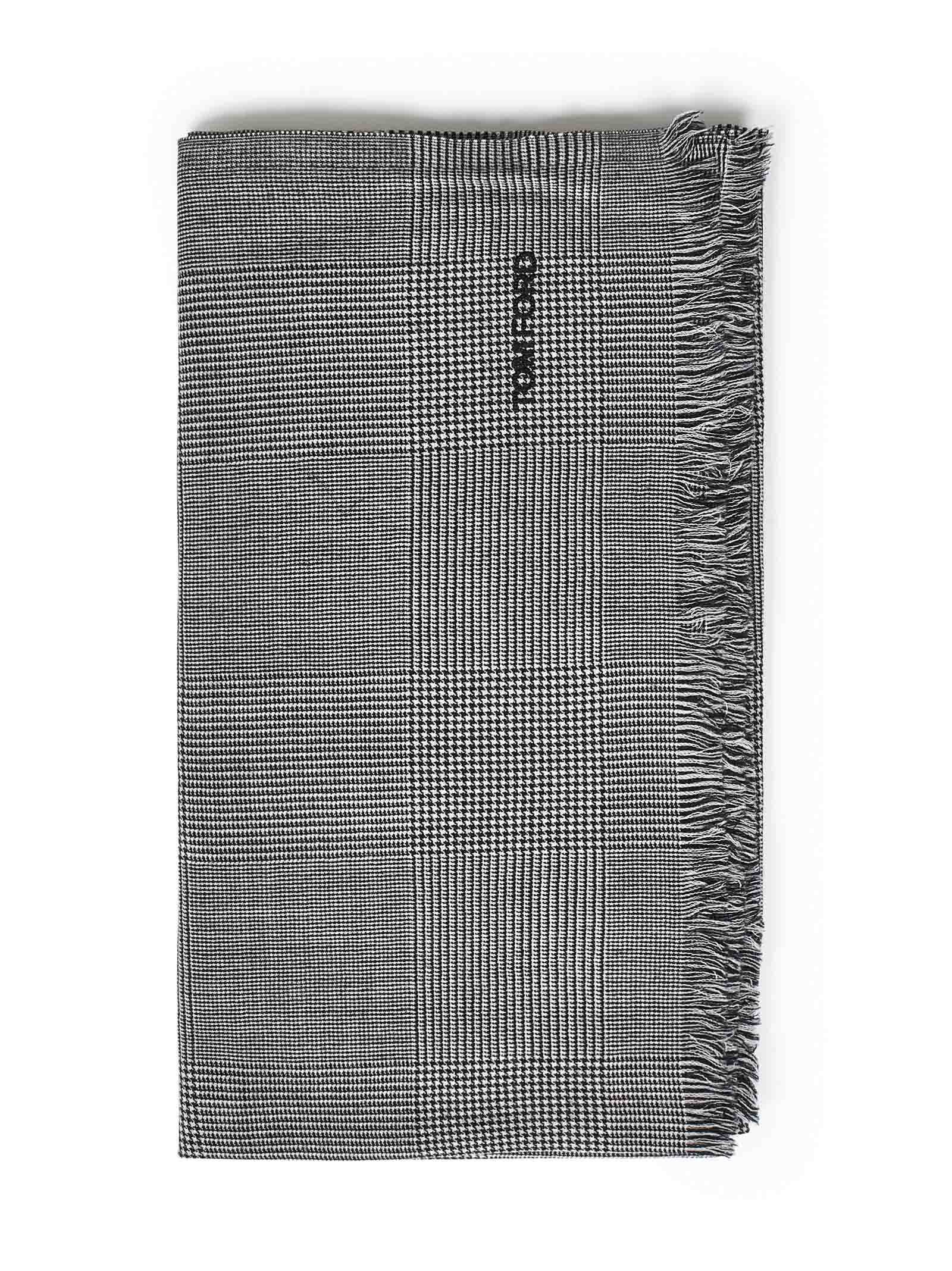 Black and off-white Prince of Wales wool scarf with embroidered logo.