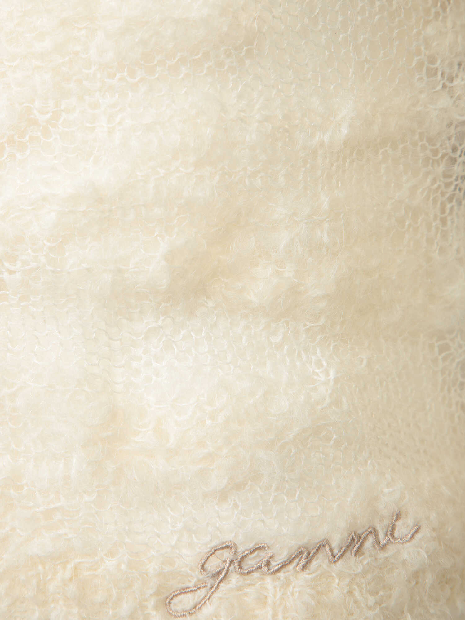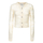 Long sleeve cardigan. Rhinestone button details. Scalloped hem.. This elegant Ganni ivory knit cardigan features a sophisticated front button closure adorned with sparkling rhinestones, perfect for adding a touch of glamour to your everyday wardrobe.