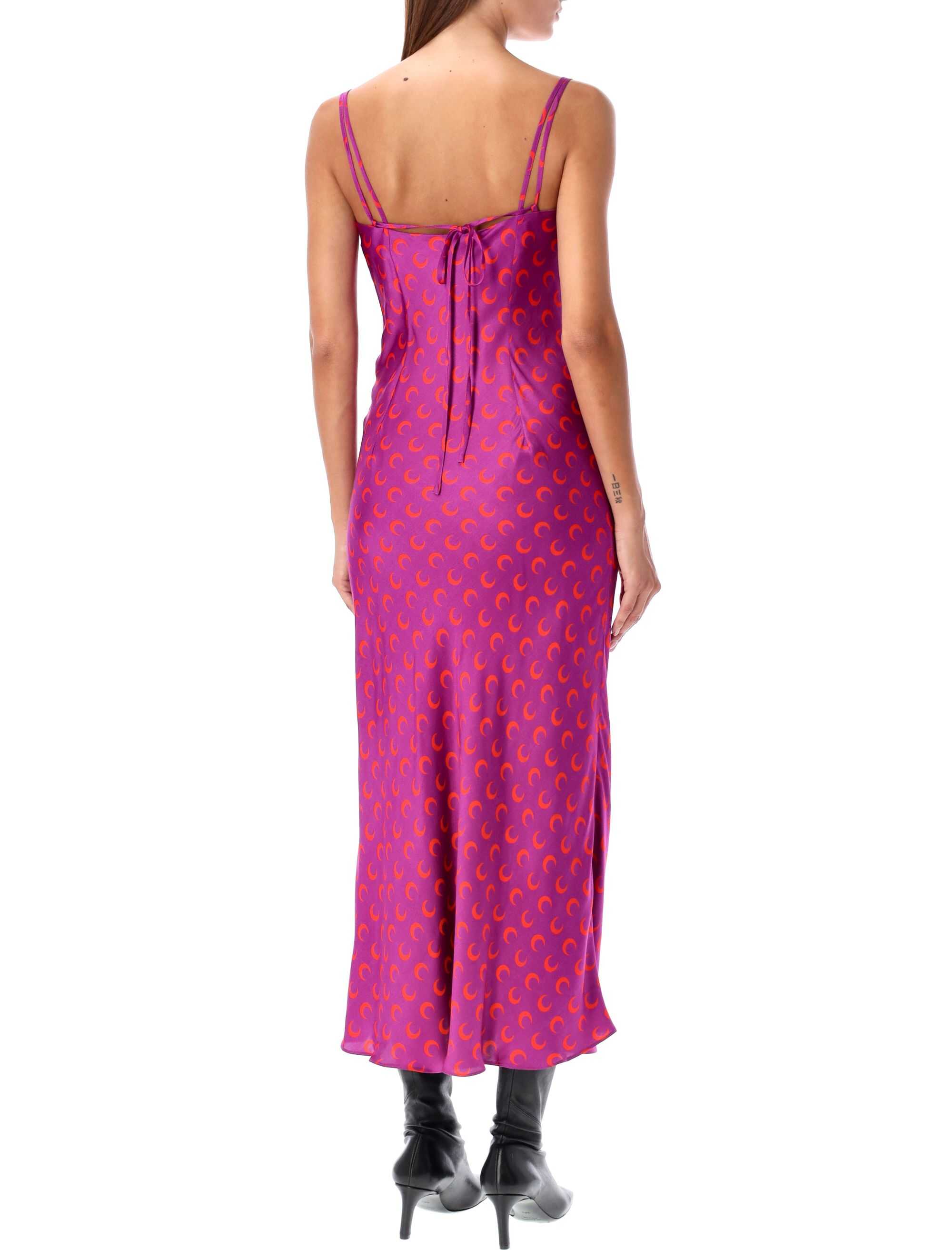 Make a striking statement with the Moon Flou long slip dress in elegant purple by Marine Serre. Crafted from 100% viscose, this dress features an all-over moon print, a cowl neckline, and a relaxed fit for ultimate comfort. Perfect for any occasion, this midi-length dress is a must-have for your wardrobe. Model is 1,72m and wears size 36.