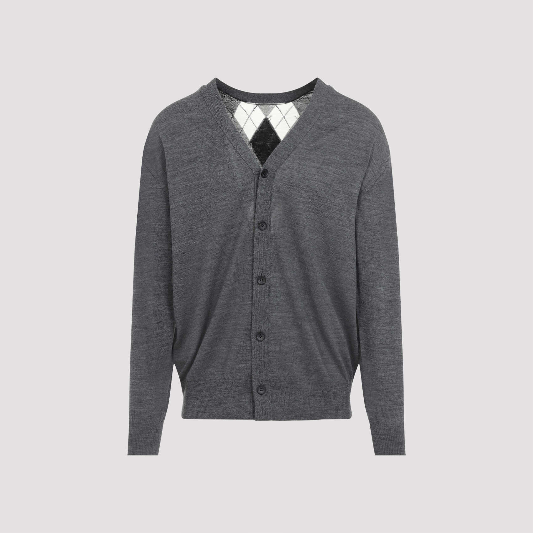 Elevate your style with the JUNYA WATANABE WNN015W24 sweater. Crafted from luxurious 100% gray wool, this v-neck beauty features a buttoned front, ribbed edges, and a unique diamond pattern, making it perfect for any sophisticated wardrobe.