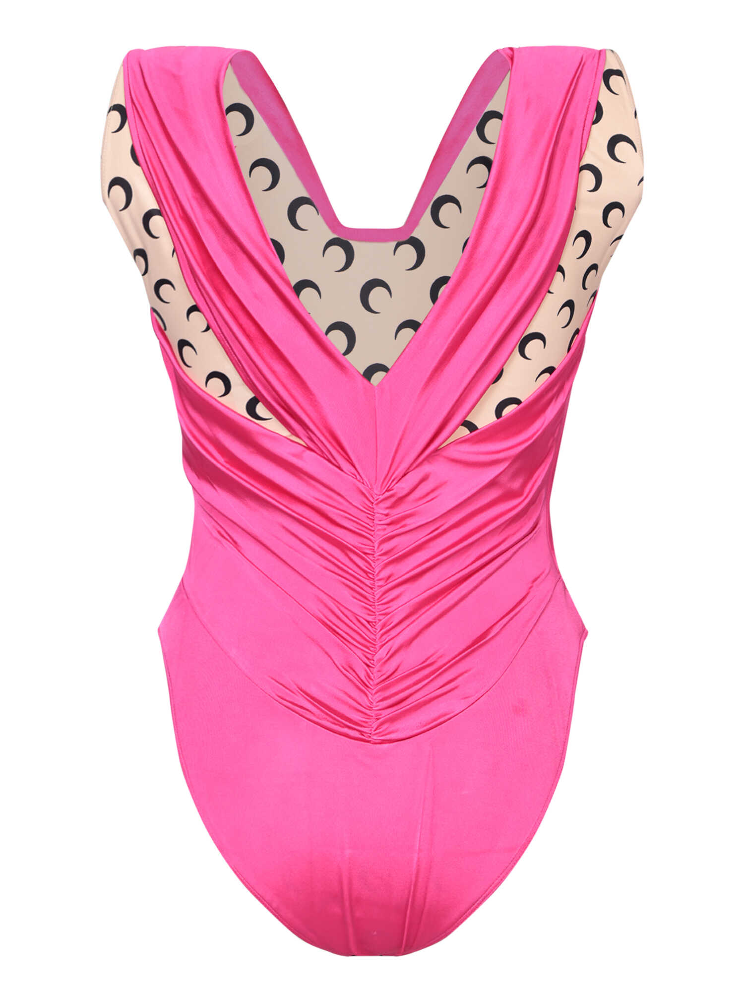 Elevate your style with the MARINE SERRE Pink Sweaters. This stunning long sleeve jersey bodysuit features a vibrant fuchsia hue with beige inserts adorned with the symbolic moon motif. Crafted from 95% Viscose 5% Elastane, it offers a comfortable fit and a bold metallic ring detail on the chest. Perfect for adding a touch of glamour to your wardrobe.