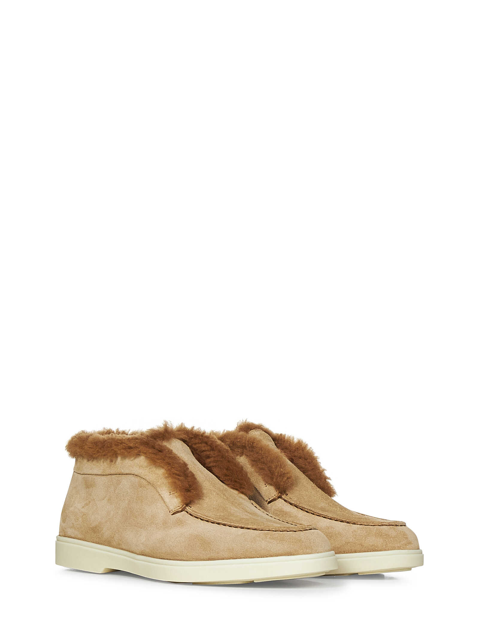 Desert light brown suede ankle boots with fur trims and rubber sole.