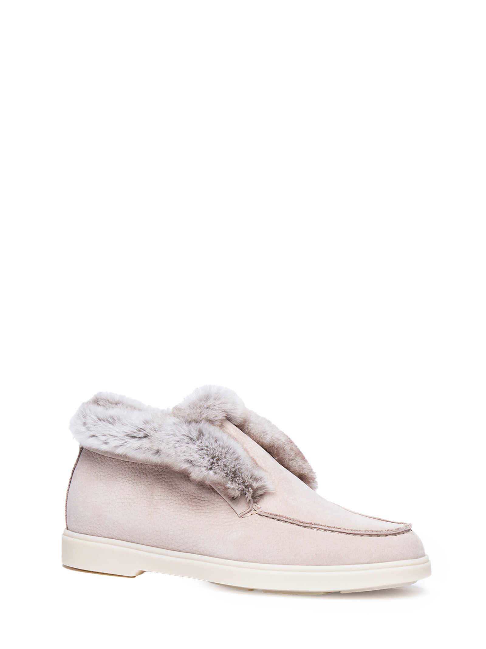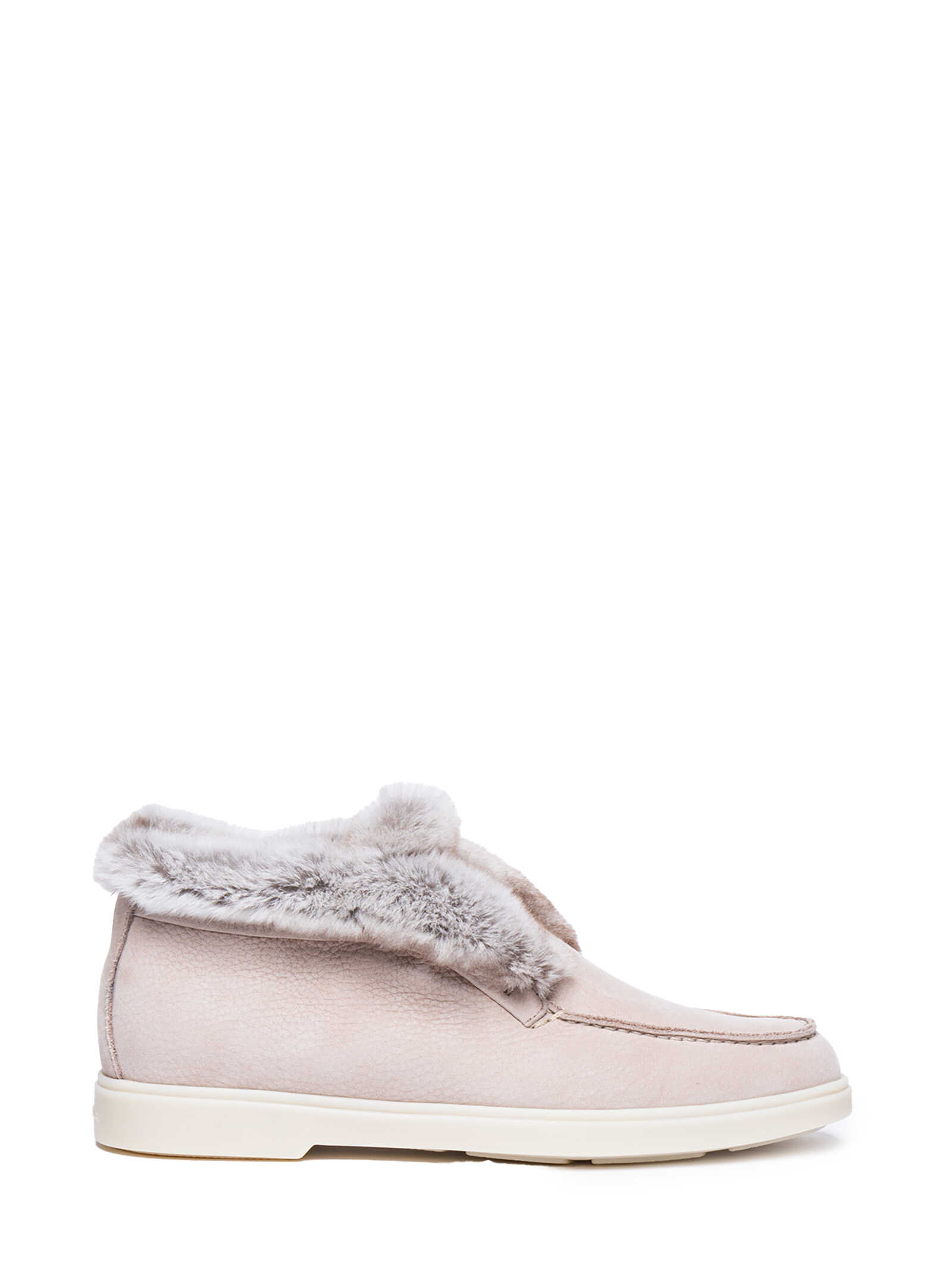 Desert ankle boots in drummed pink nubuck with rabbit fur edges.