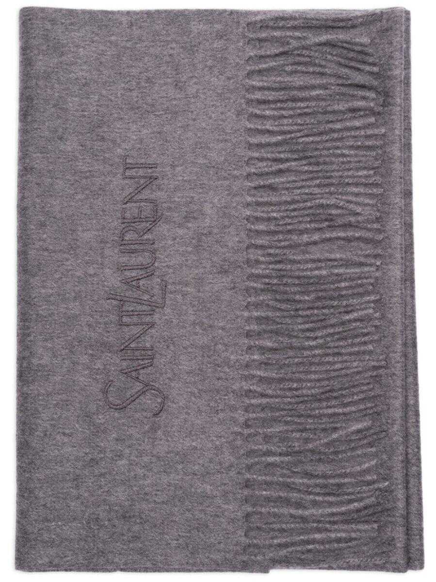 anthracite grey cashmere brushed effect embroidered logo to the front self-tie fastening rectangle shape fringed edge