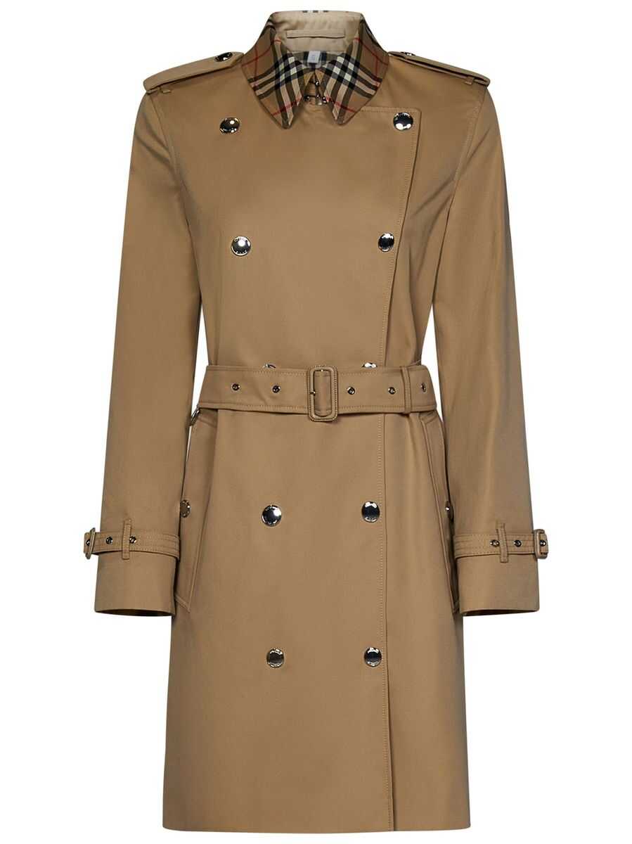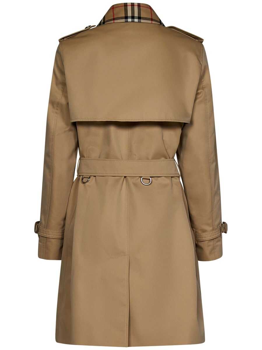 Vintage Check-trim short trench coat from BURBERRY featuring beige, cotton blend, gabardine weave, wide notch lapels, epaulettes, double-breasted press-stud fastening, belted waist, long sleeves, belted cuffs, two press-stud fastening side pockets, Vintage Check-pattern lining, thigh-length and straight hem.