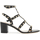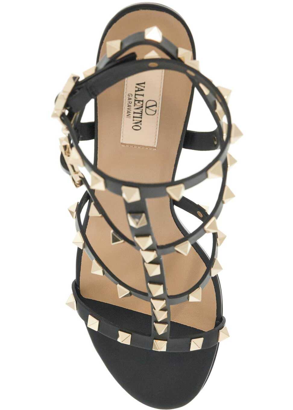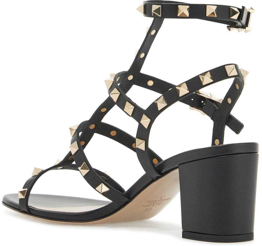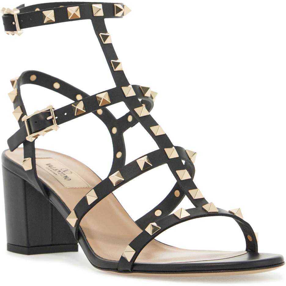 Valentino Garavani's Rockstud sandals feature leather straps adorned with the iconic platinum-finished metal studs. The two adjustable straps have side buckles detailed with raised studs, a covered heel, leather insole, and leather sole.