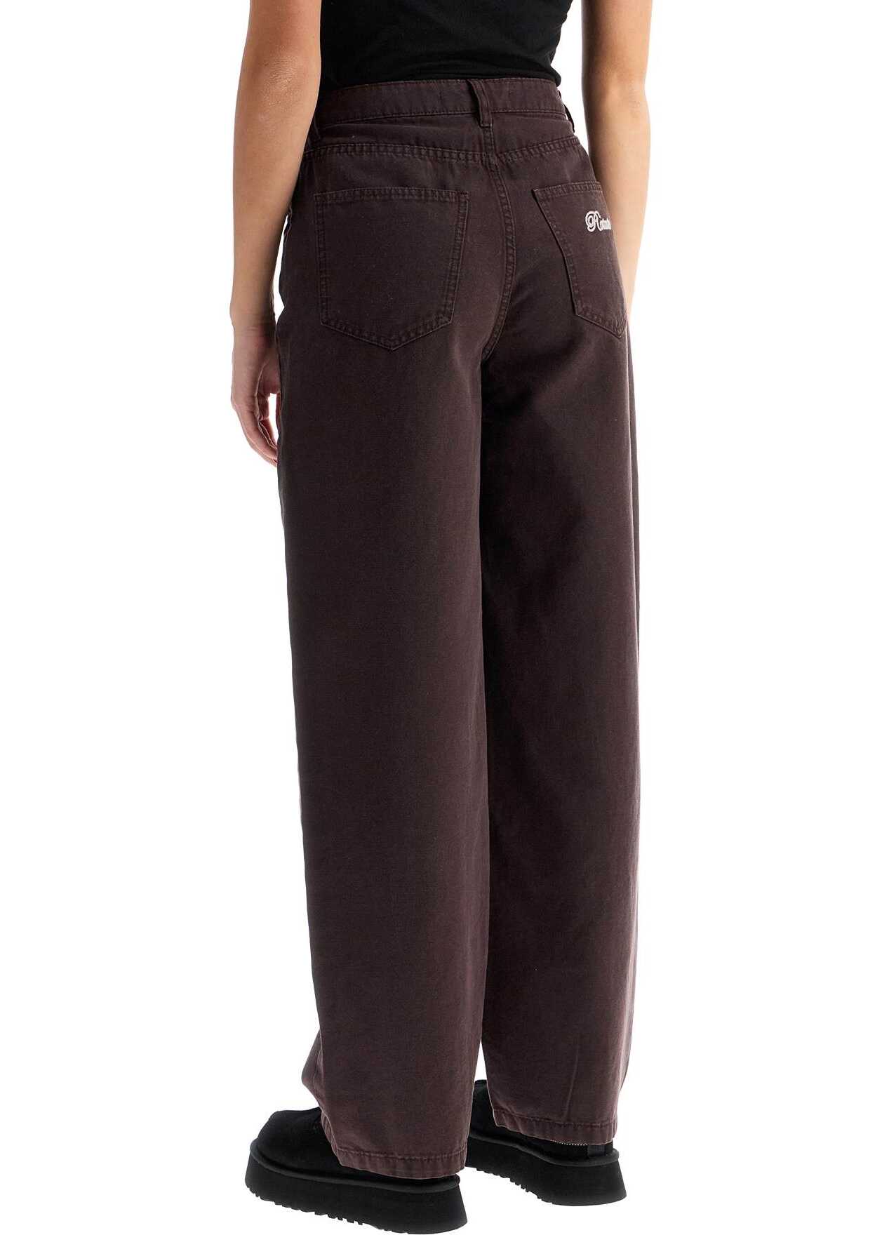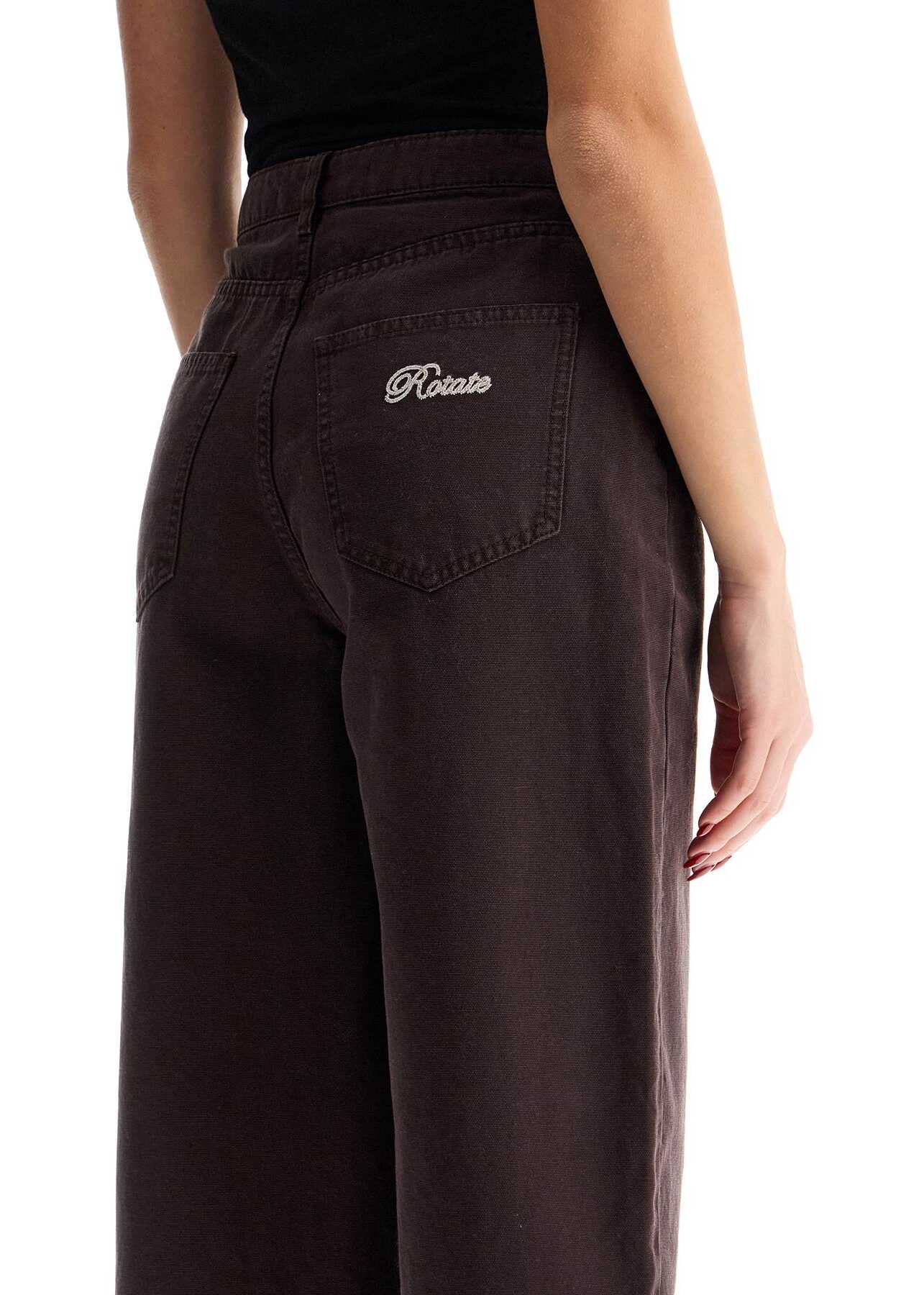 "Introducing our Rotate five-pocket pants, made from pure organic cotton fabric. These stylish pants feature a contrasting embroidered logo on the back pocket and a wide leg silhouette. They are designed with a hidden zip and button closure. The model is 177 cm tall and wears a size 26."
