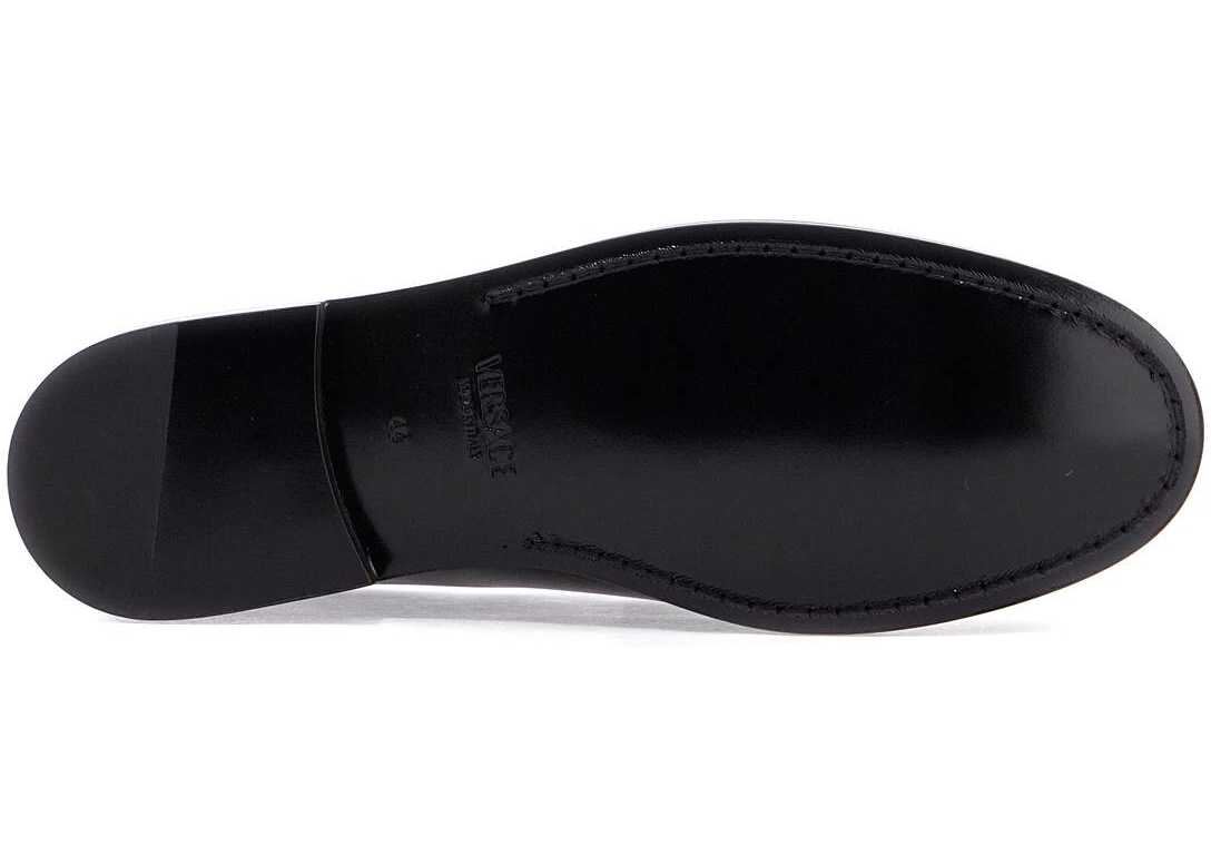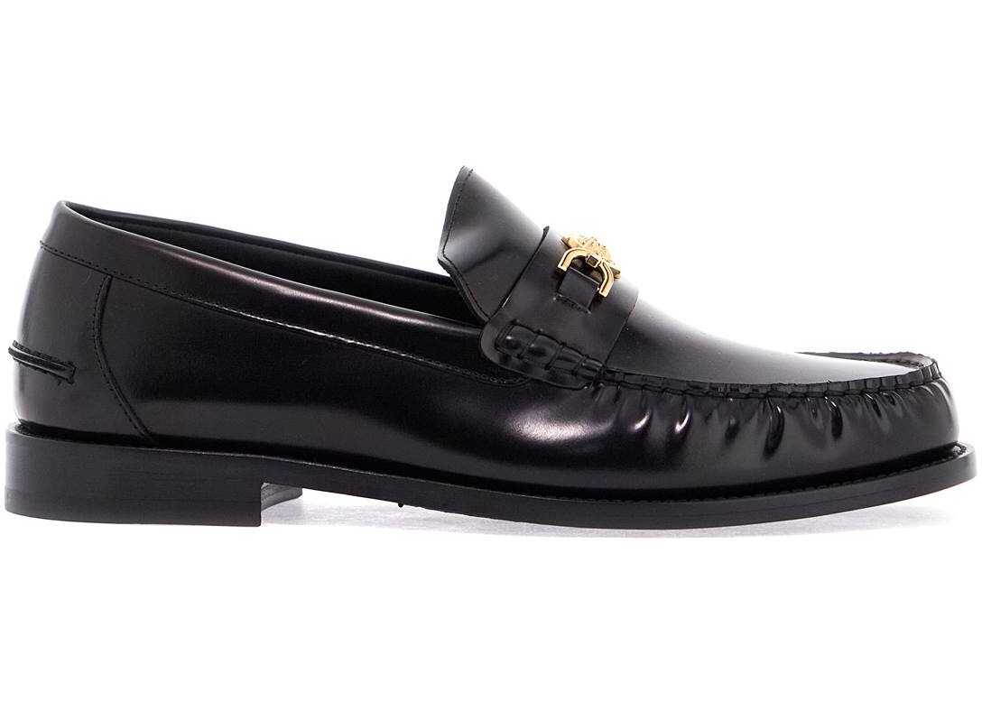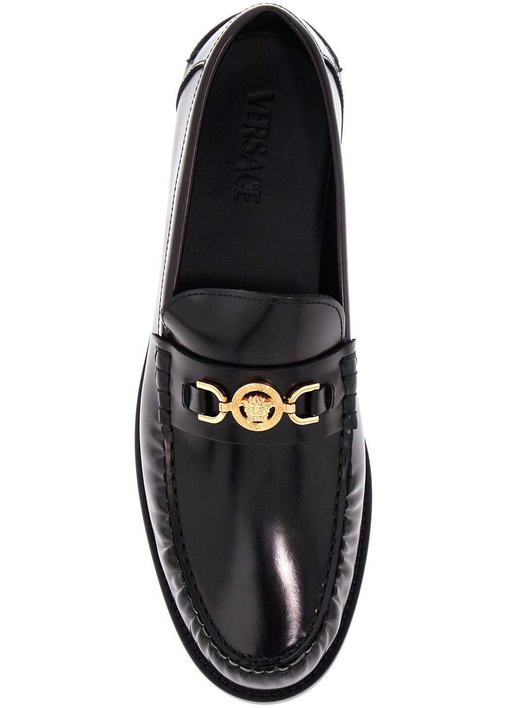 Versace loafers crafted in brushed leather and decorated with gold-finished metal Medusa '95 on the penny bar. Leather interior and leather sole.