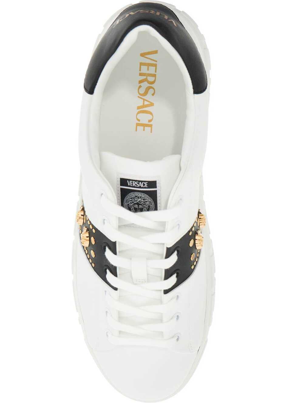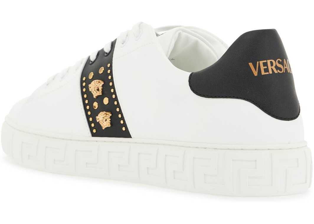 These Versace sneakers are made of eco-leather and adorned with Medusa and gold-finished studs. They feature a front lace-up closure, fabric logo patch, lined interior with removable insole, contrasting spoiler with golden lettering logo, and rubber sole with Greca pattern.
