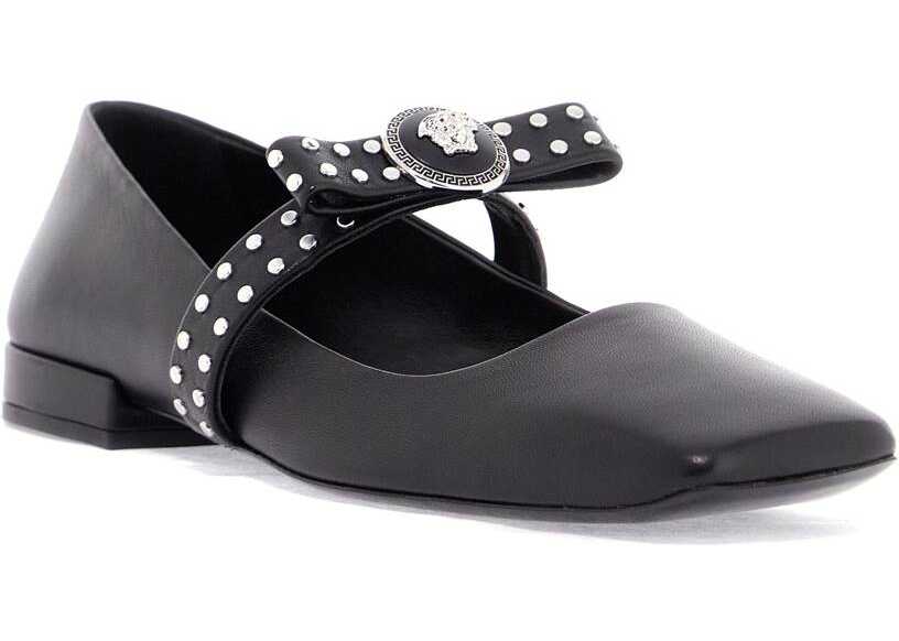 Versace ballerinas made of nappa leather with a square toe and featuring the iconic Medusa detail enamelled on the "Gianni ribbon" bow, all adorned with micro studs. Leather interior and leather sole.