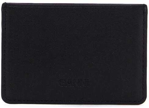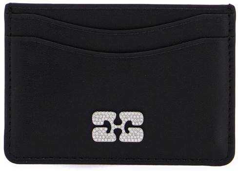 Ganni's credit card holder is made of recycled leather and adorned with a silver metal Butterfly logo embellished with crystals. It features two slots and a central compartment.