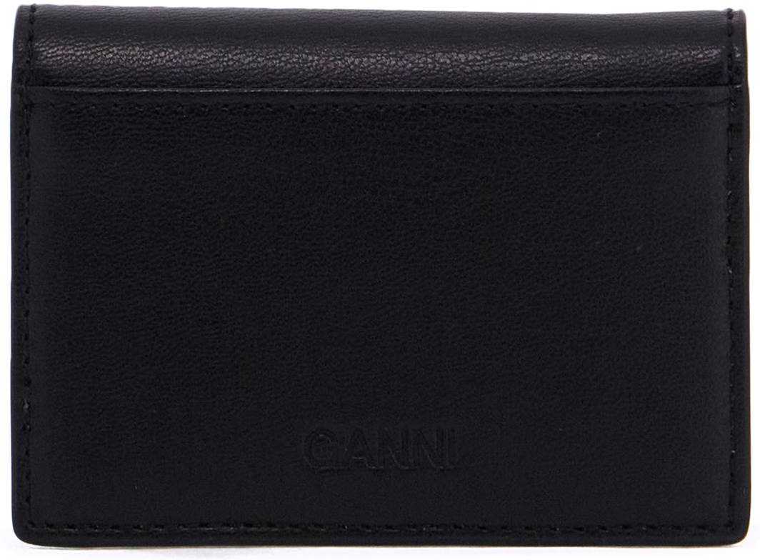 The Ganni card holder is made of recycled leather and features a metal Butterfly logo embellished with crystals on the flap. It has a snap button closure, one main compartment, two slots, and an additional one on the back. The holder also comes with a keychain ring and charm.