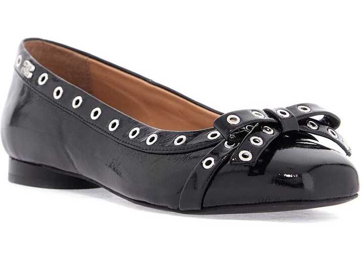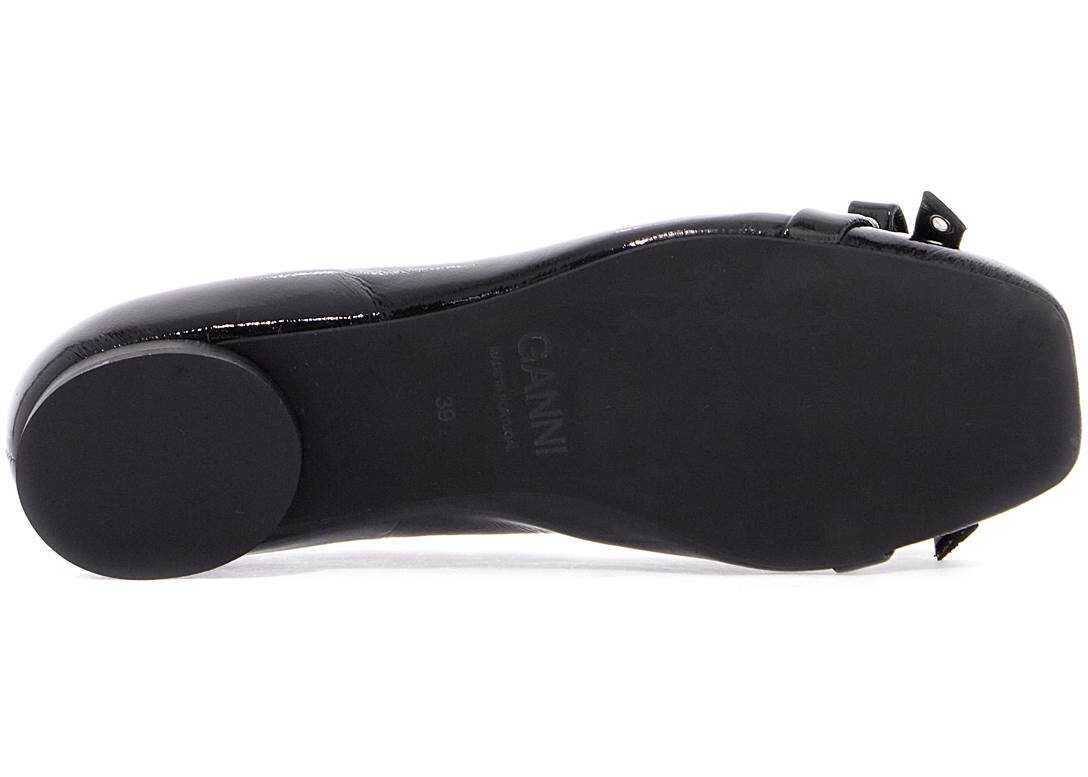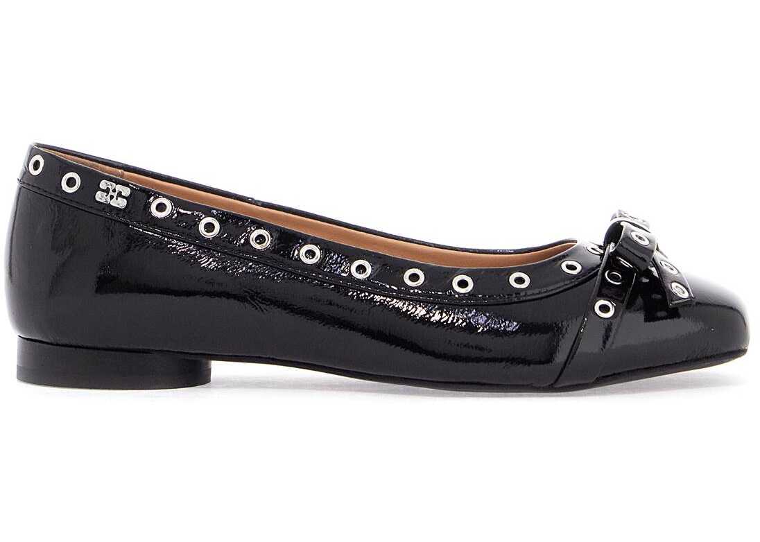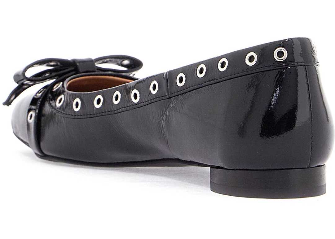 These Ganni ballerina flats are made of patent leather and feature a square toe adorned with a bow and embellished with studs. The interior is lined with faux leather and the sole is made of rubber.