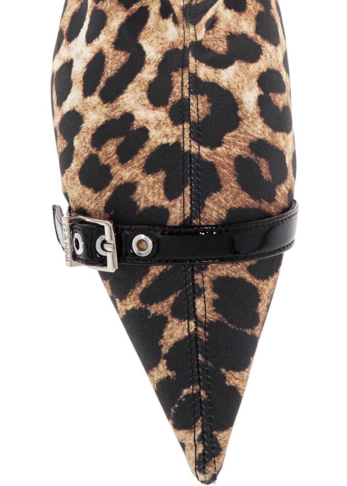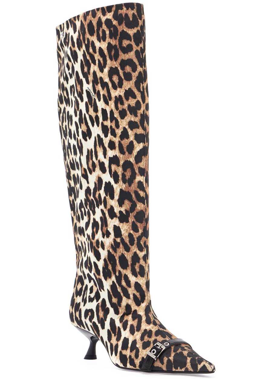 Ganni boots made of animal print fabric, featuring a pointed design with a decorative buckle, kitten heel and small silver Butterfly logo applied on the side. The interior is made of eco-leather and the sole is made of rubber.
