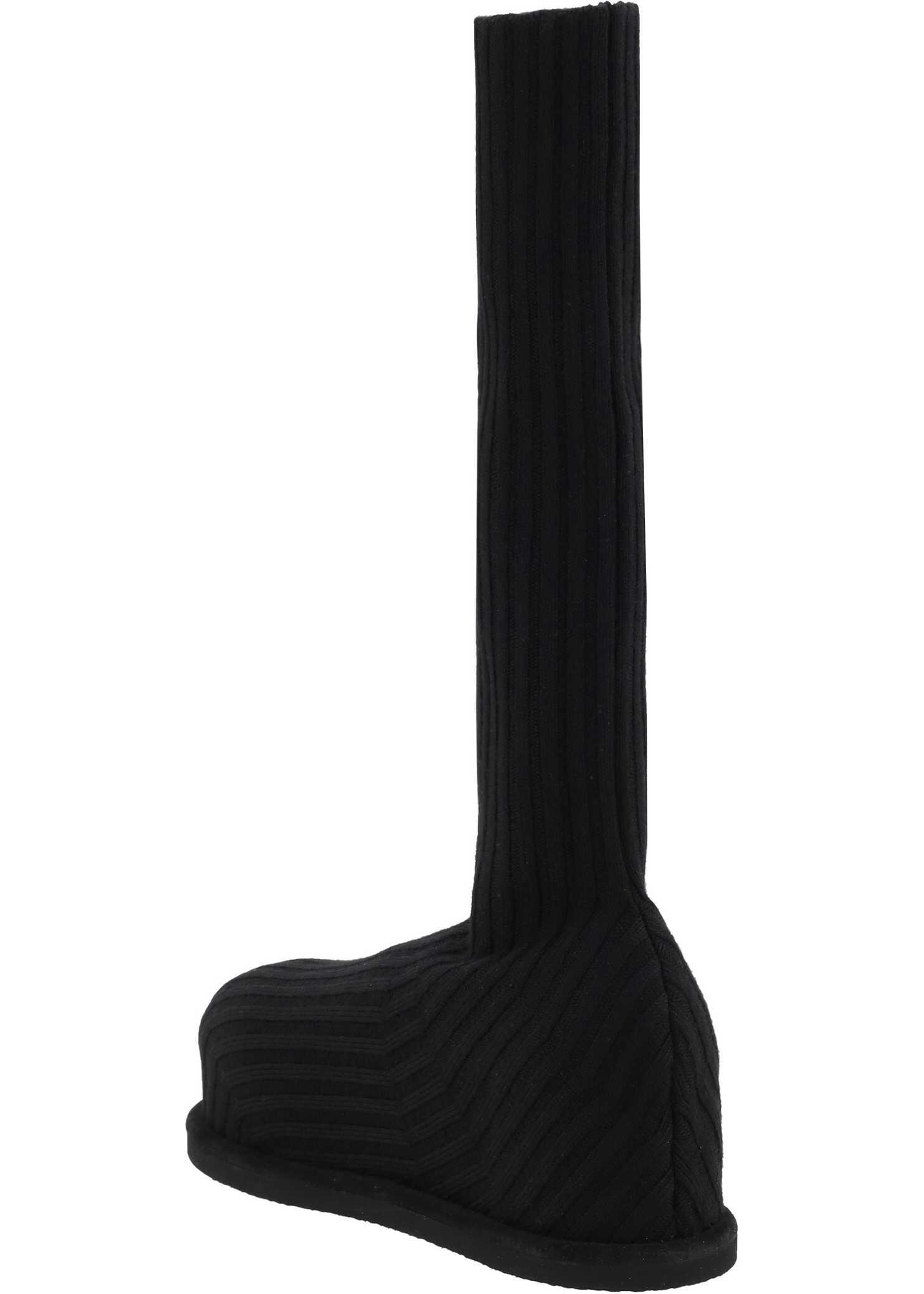 Wool Veneda Stretch Boots by Amina Muaddi, round toe, ribbed stocking effect, flat sole.