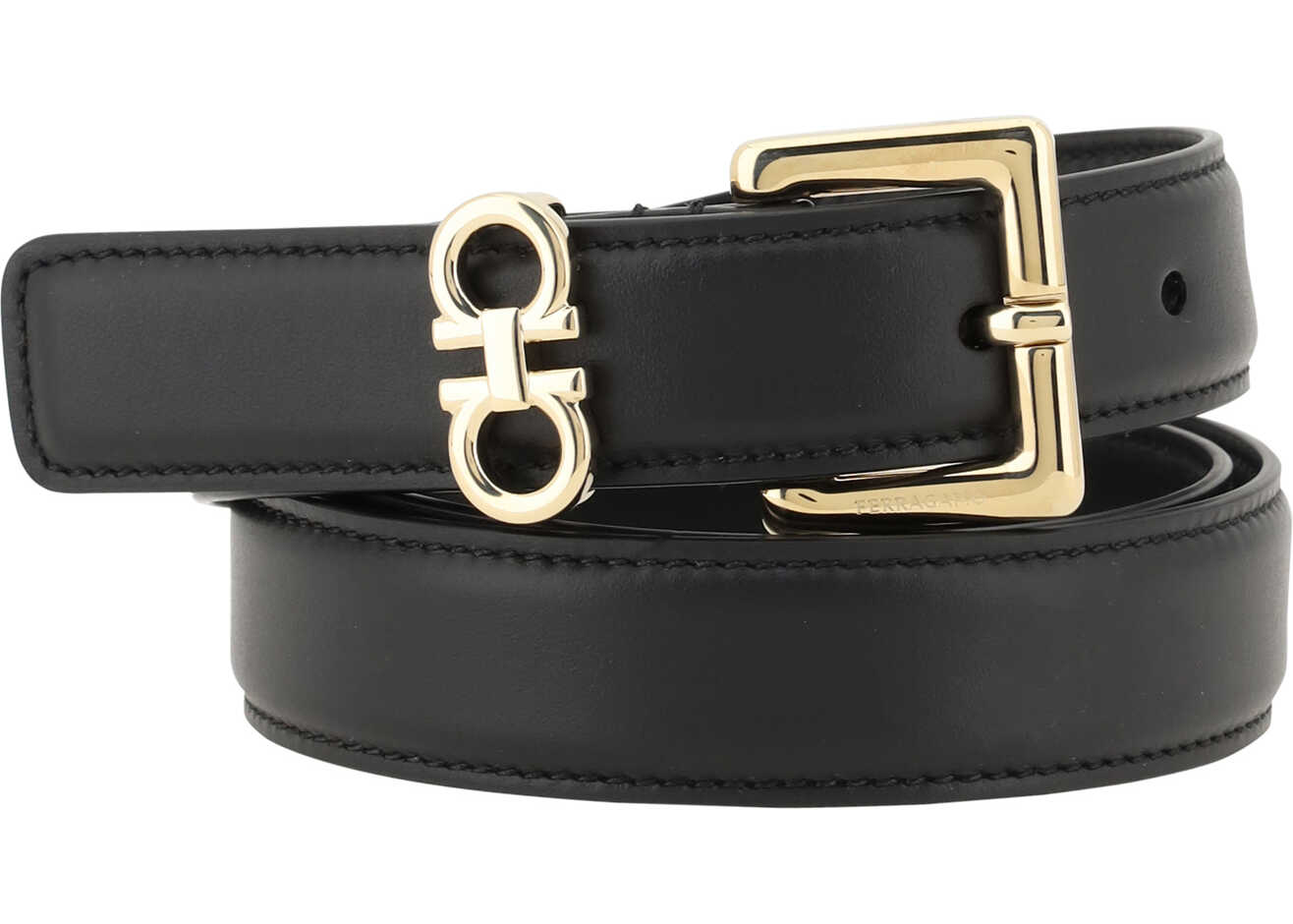 Leather Belt by Ferragamo, square buckle with the brand's iconic Gancini logo, monochrome design.