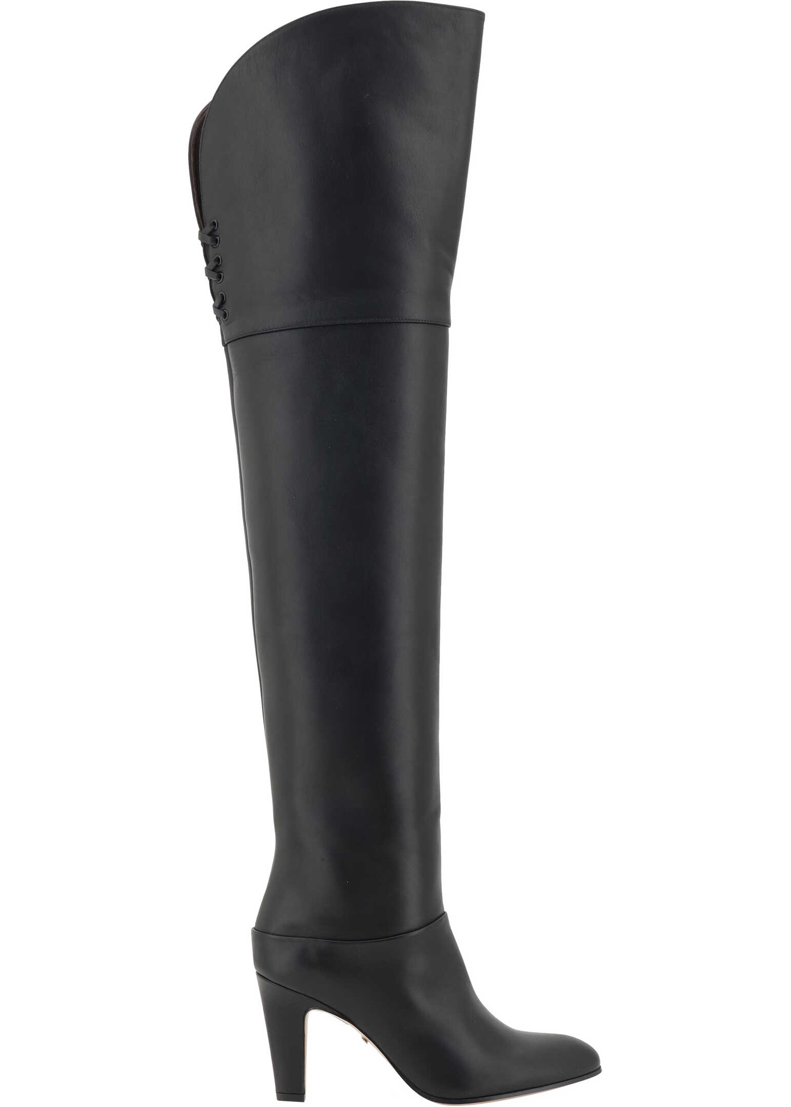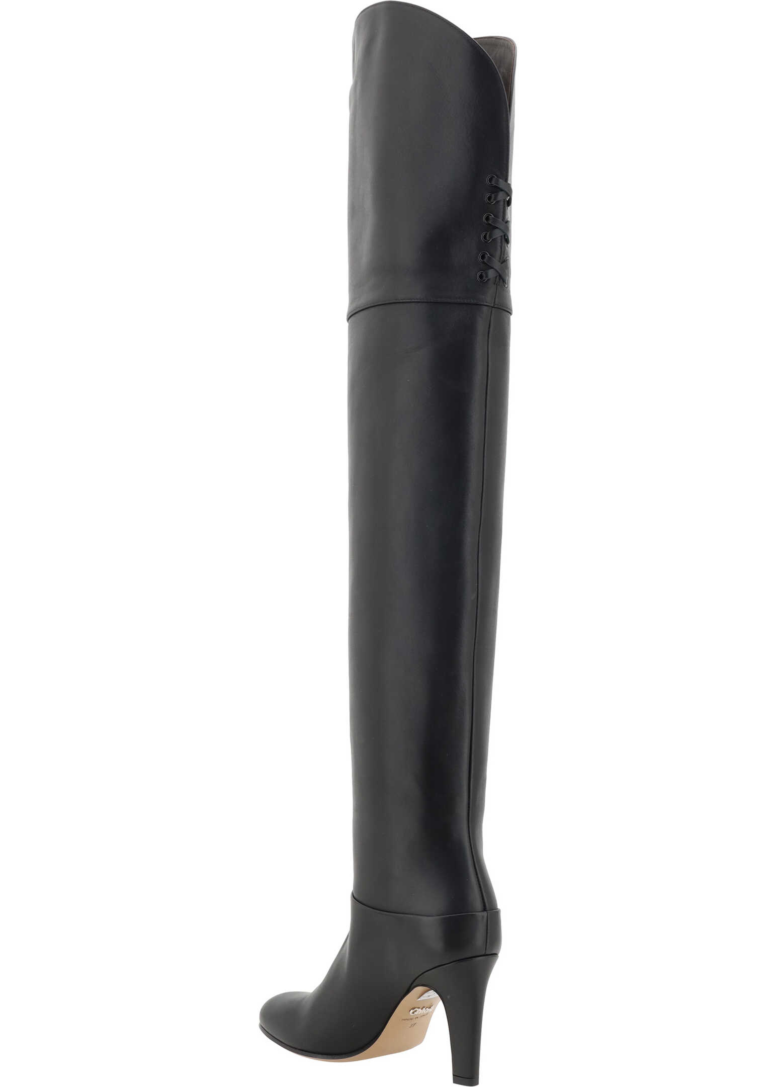 Leather Eve Boots by Chloé featuring an elongated toe, a slip-on style, a geometric heel, a high bootleg, and a logo-embossed insole.