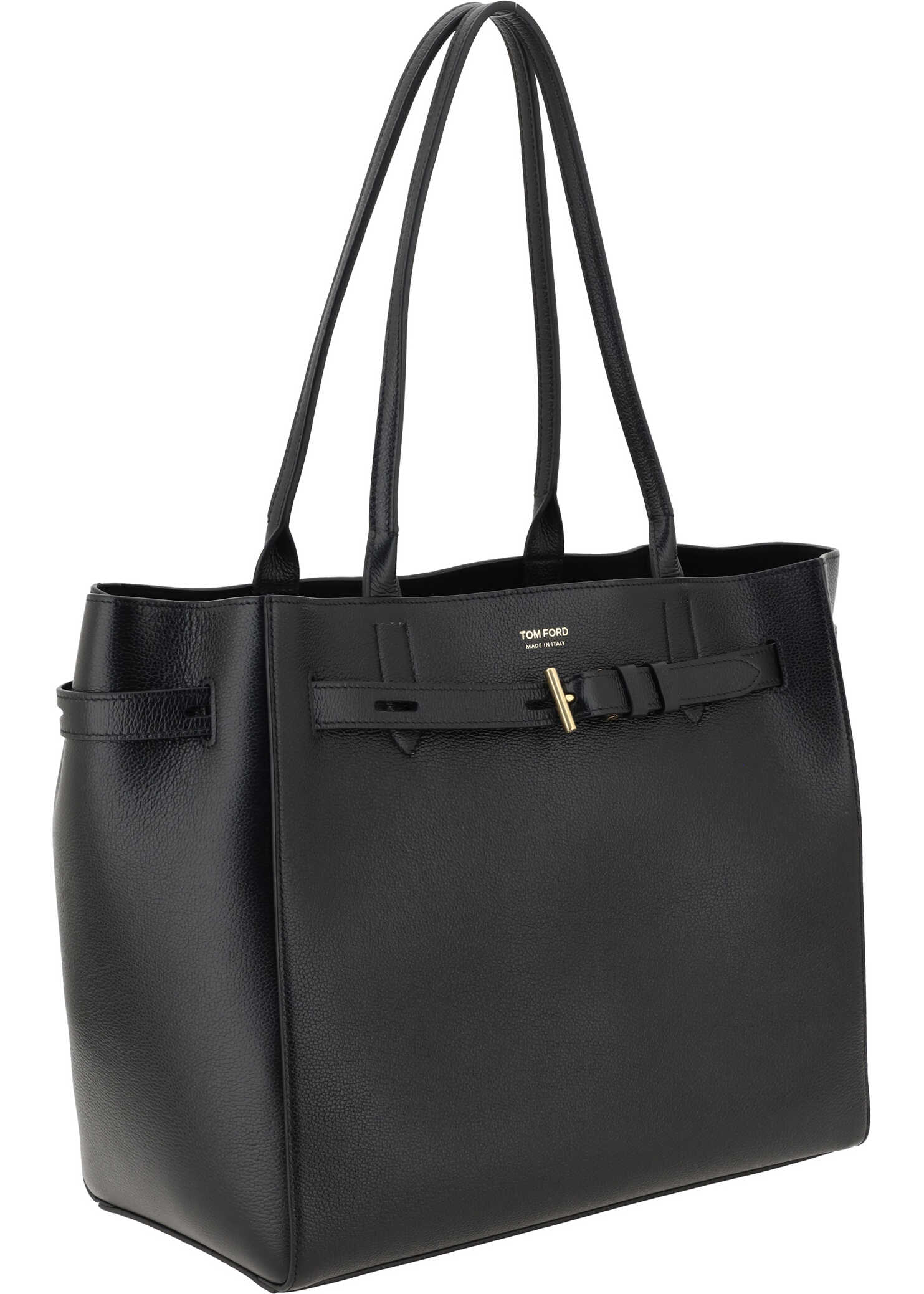 Leather Medium Shoulder Tote Bag by Tom Ford, grained leather design, two flat top handles, belt closure at top, iconic brand monogram printed in contrasting color on front panel, single interior compartment.