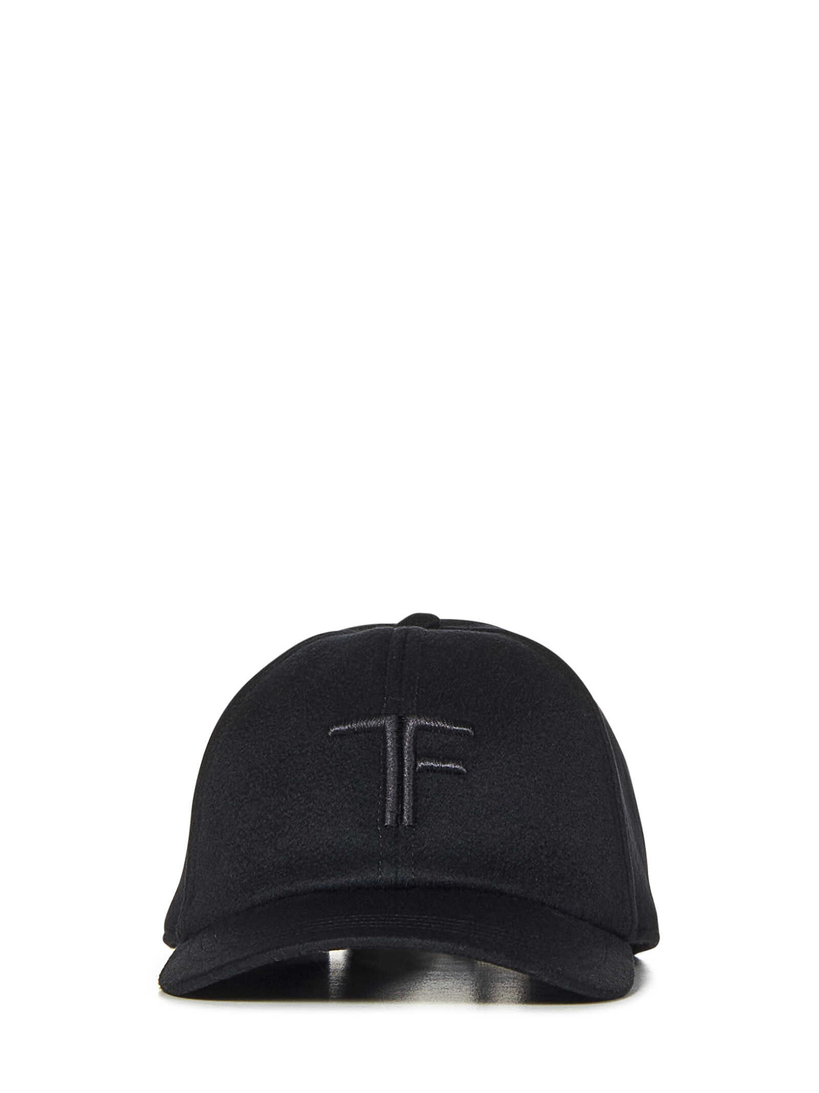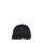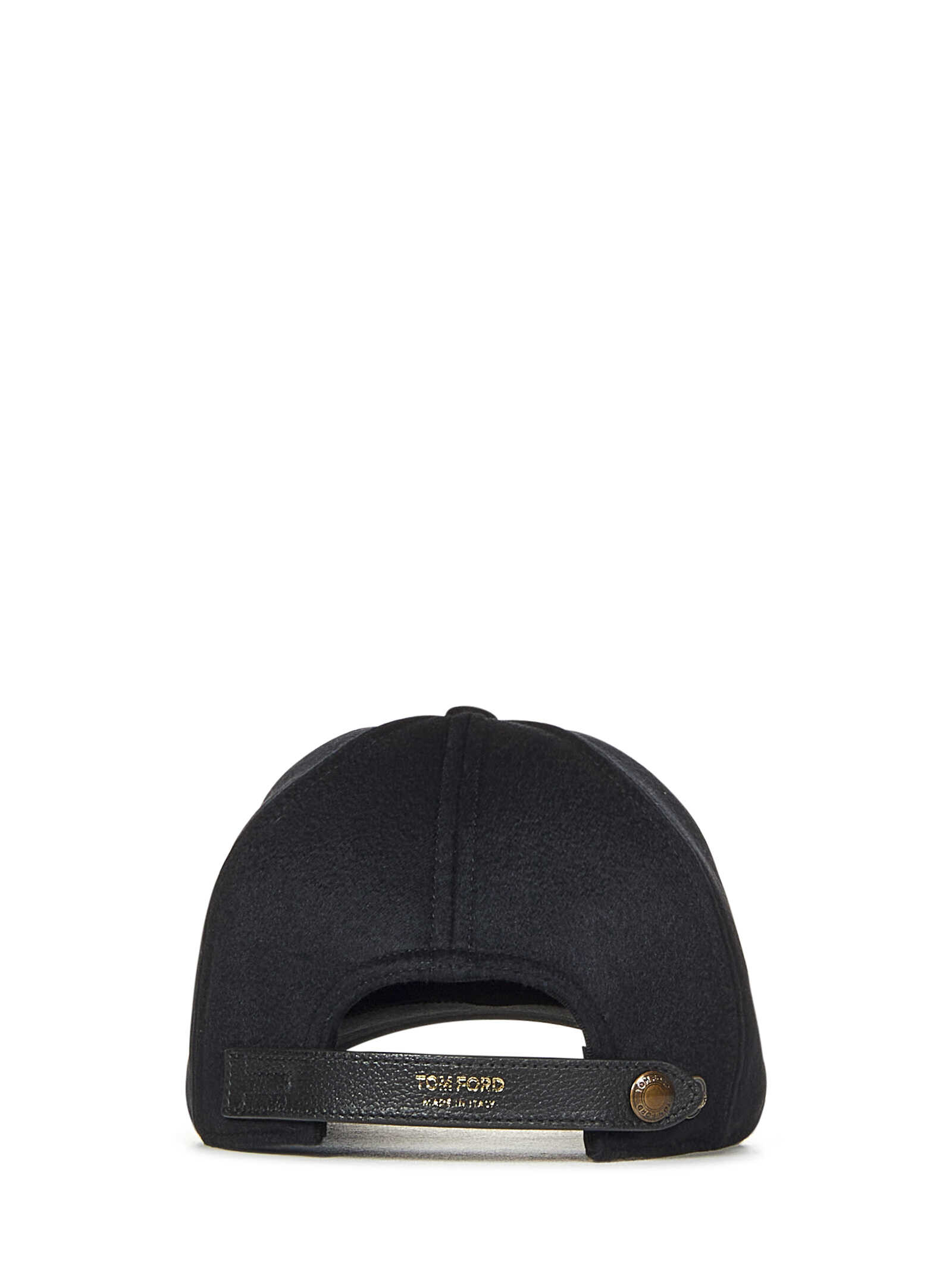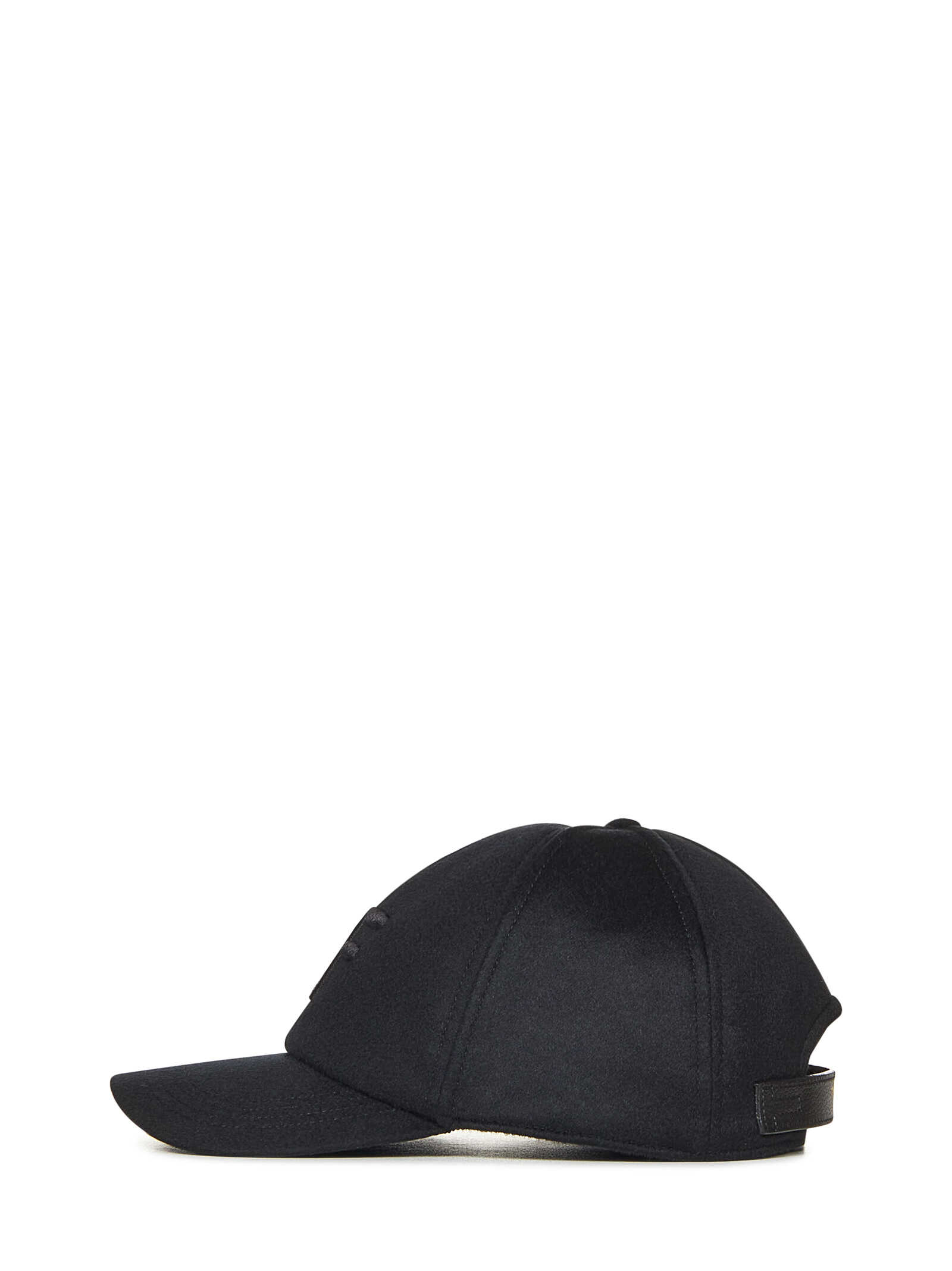 Black cashmere baseball cap with tone-on-tone logo on the front and leather strap.