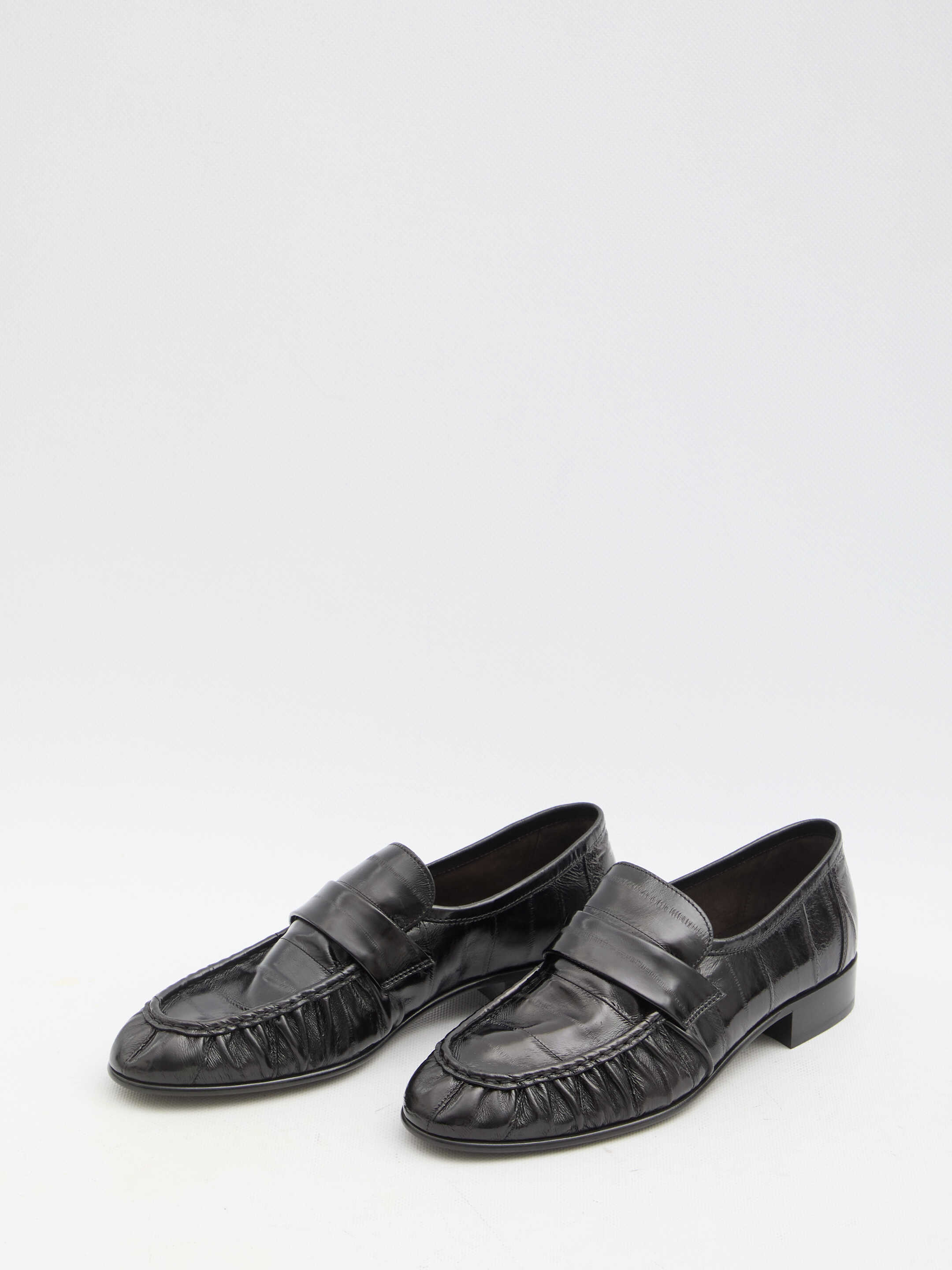 Soft loafers in black with hand-sewn details. Leather sole. Dust bag included. Any leather imperfections are not to be considered manufacturing defects, but a peculiarity of the material.