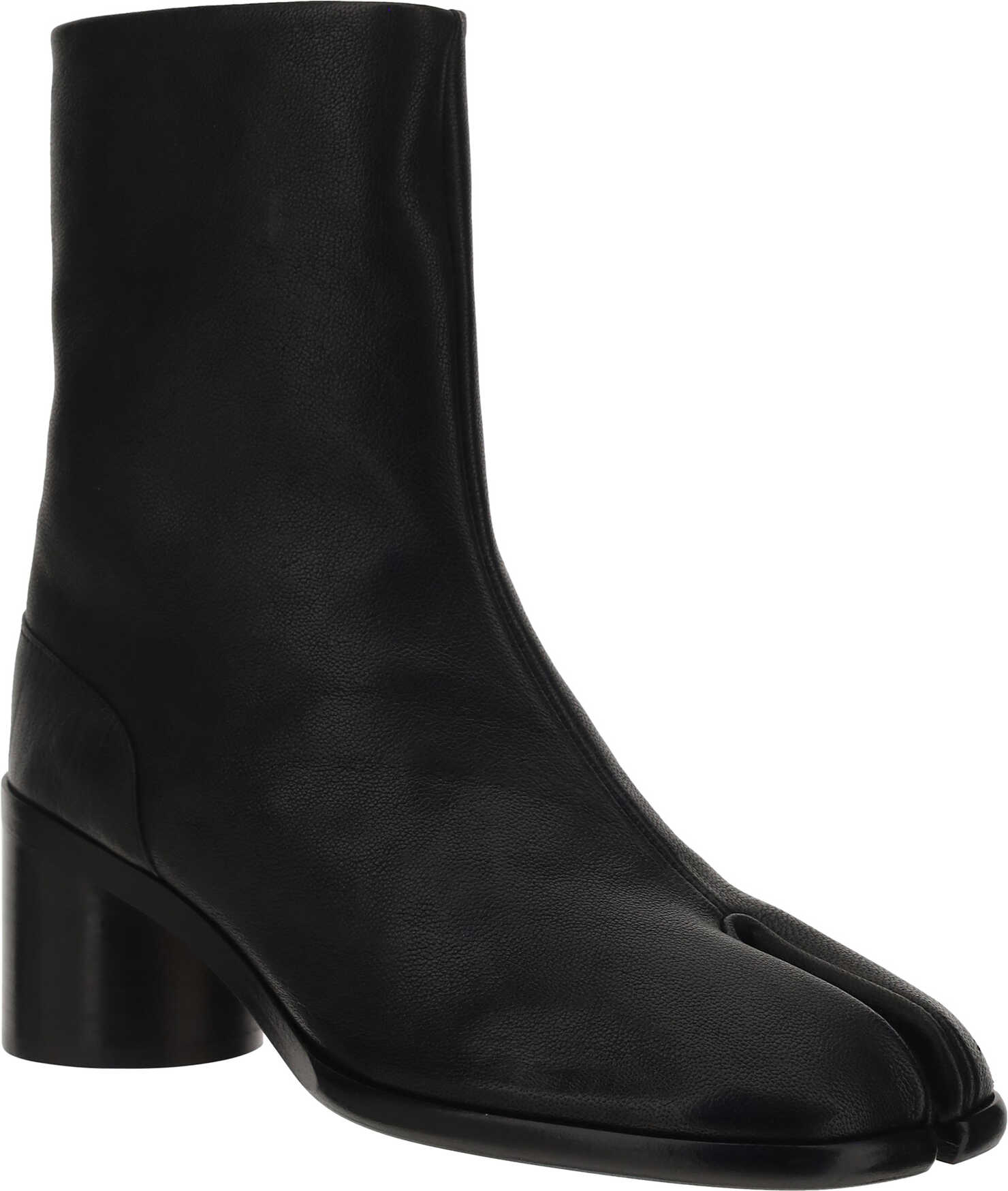 Calfskin Tabi Ankle Boots by Margiela featuring iconic Tabi almond toe on front, cylindrical heel, ankle height model, opening on inside panel with interlocking buttons for closure.