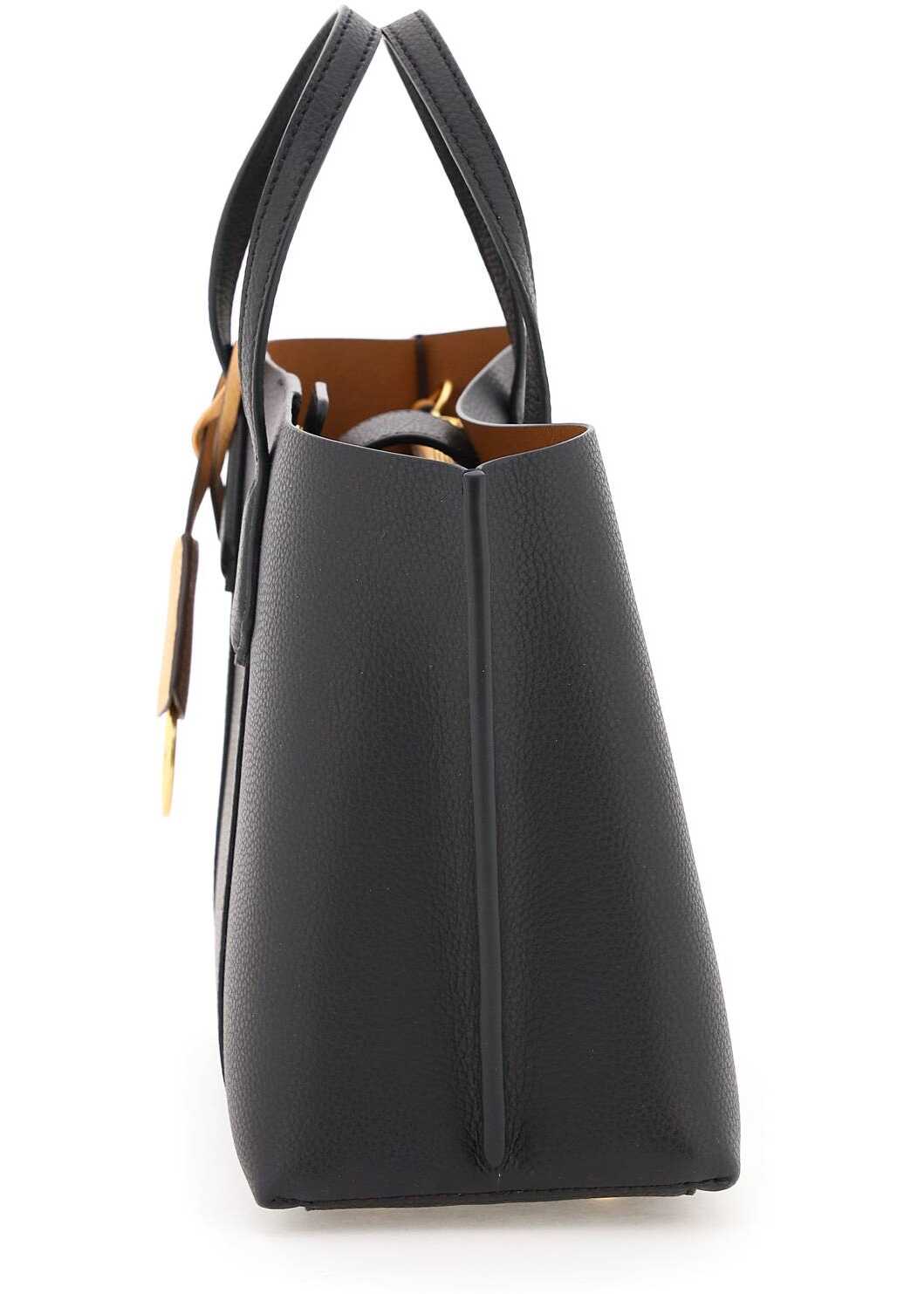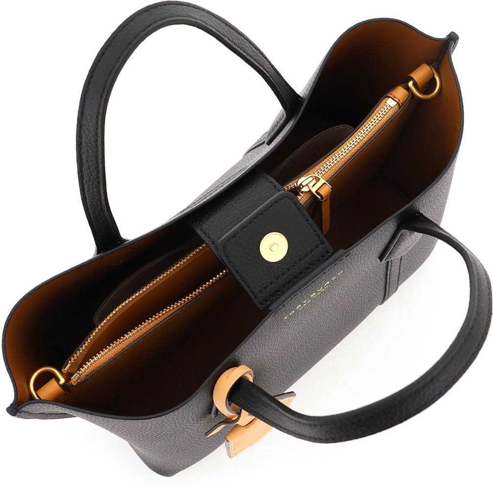Small Perry shopping bag by Tory Burch crafted in grained leather with gold-tone lettering logo print on front, removable metal Double T charm with contrasting leather cover, double handle and detachable and adjustable shoulder strap. Magnetic button closure and leather interior with two compartments separated by a zipped flat pocket with a patch pocket. Gold-finished metalware and protective studs.