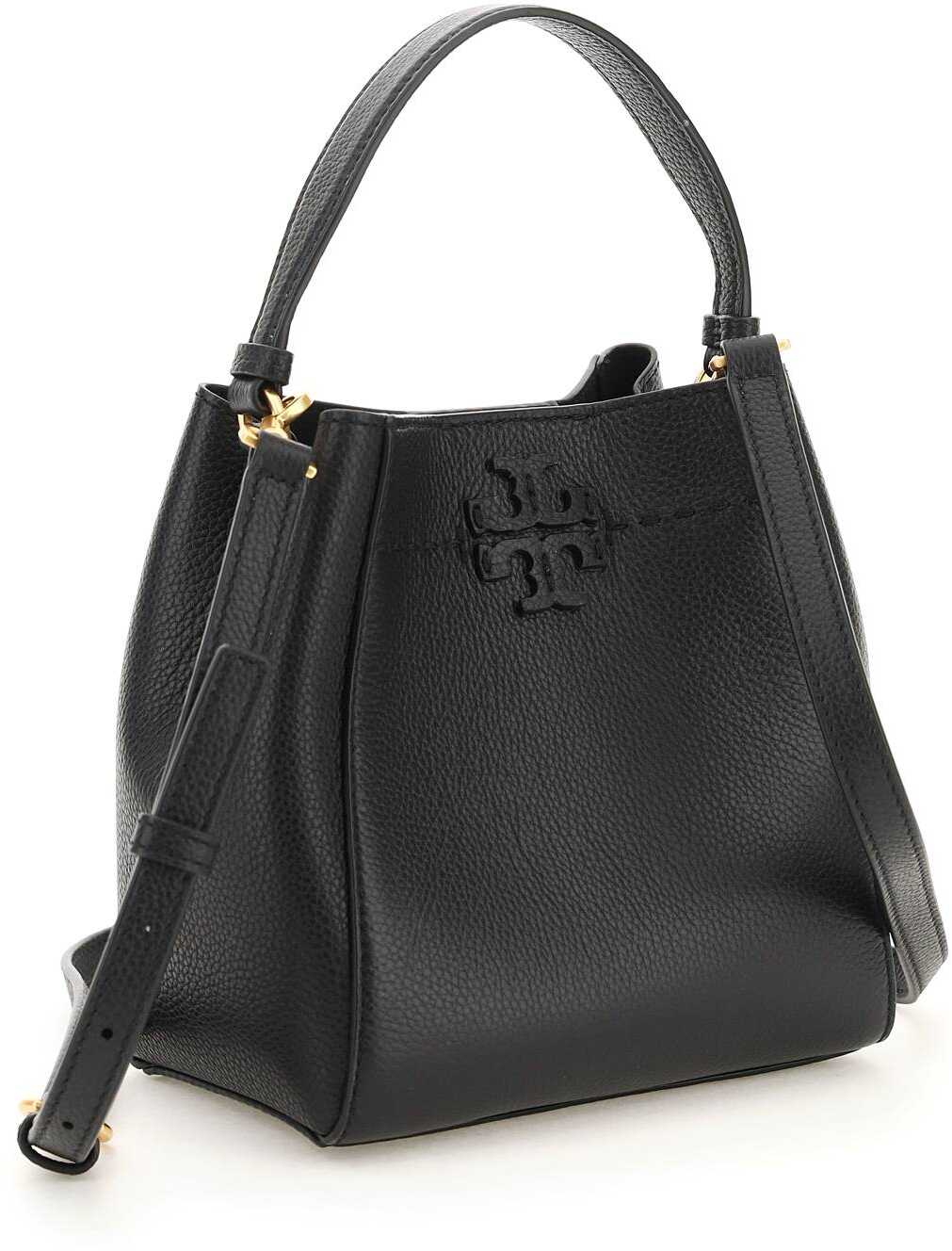 Tory Burch bucket bag in grained leather, embellished with signature leather Double T sewn at front. It features double closure with magnetic button and metal snap-hook. Unlined interior with two open flat pockets and inlaid logo. Adjustable and removable leather shoulder strap. Gold-tone metalware.