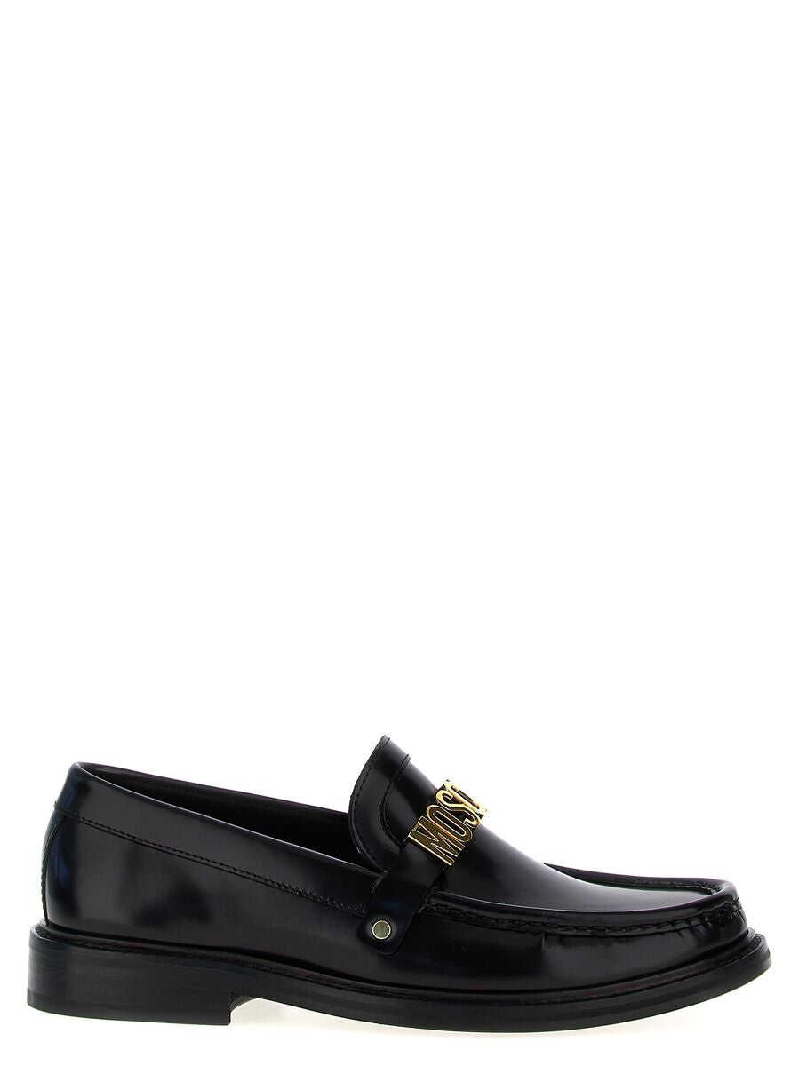 Black loafers from Moschino featuring round toe, frontal gold tone logo, leather sole and details.