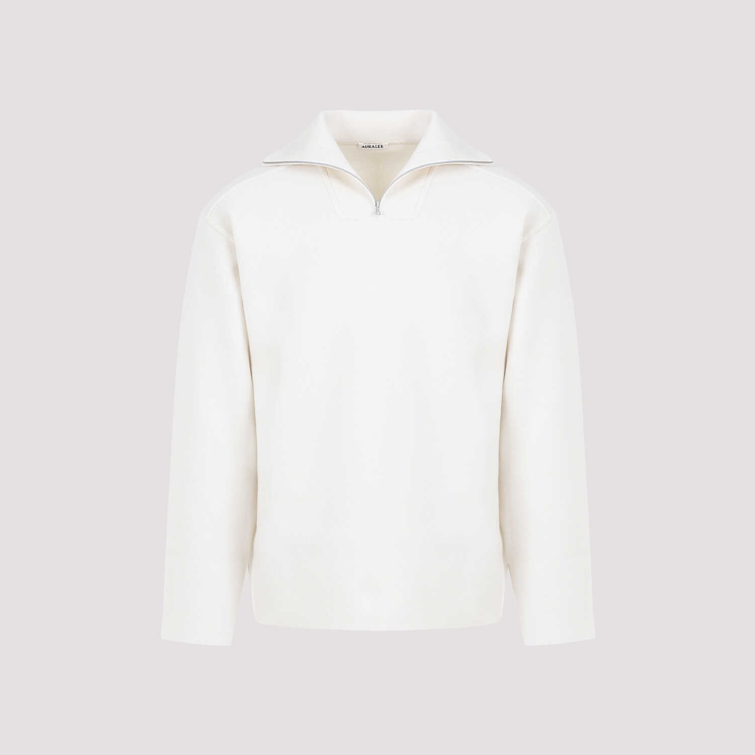 Stay warm and stylish in this luxurious AURALEE A23AT01HM pullover. Made from a blend of wool, nylon, and polyurethane, this white sweater features a standing collar with a half-zip closure and tonal raised stitching for a sophisticated look. Perfect for adding a touch of elegance to your winter wardrobe.