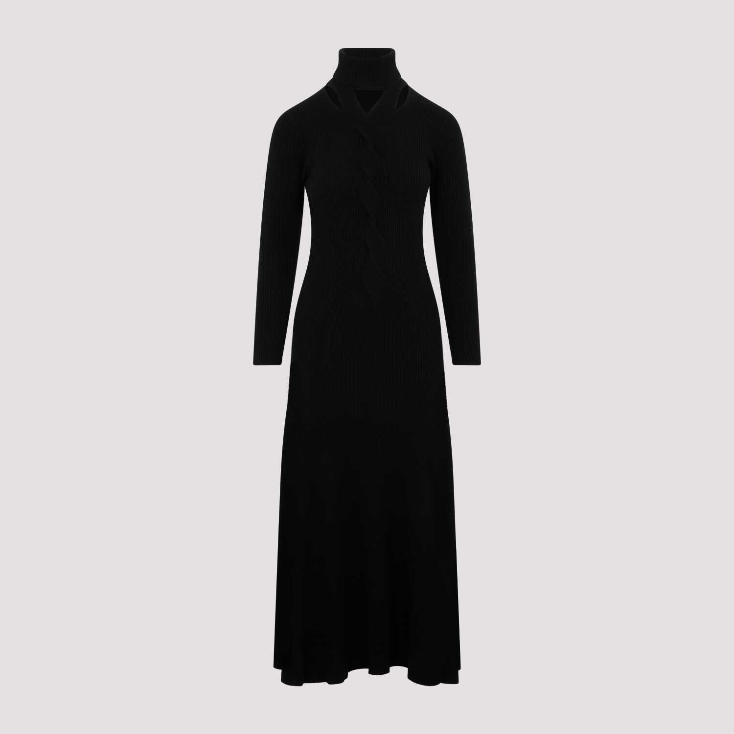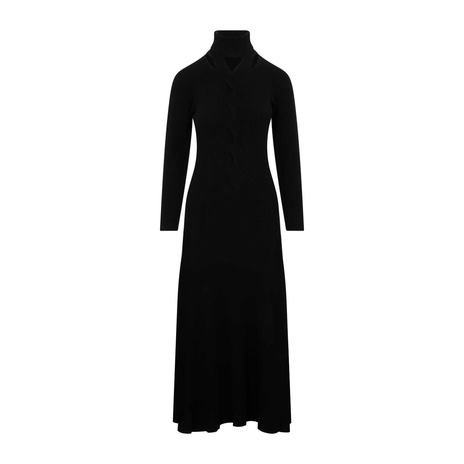 Elevate your style with this stunning Fabiana Filippi black long dress. Made from a luxurious blend of virgin wool, silk, and cashmere, this dress features a mock collar with cut out details, long sleeves, and a flared skirt. Perfect for any formal occasion, this dress exudes elegance and sophistication. Add this timeless piece to your wardrobe today.