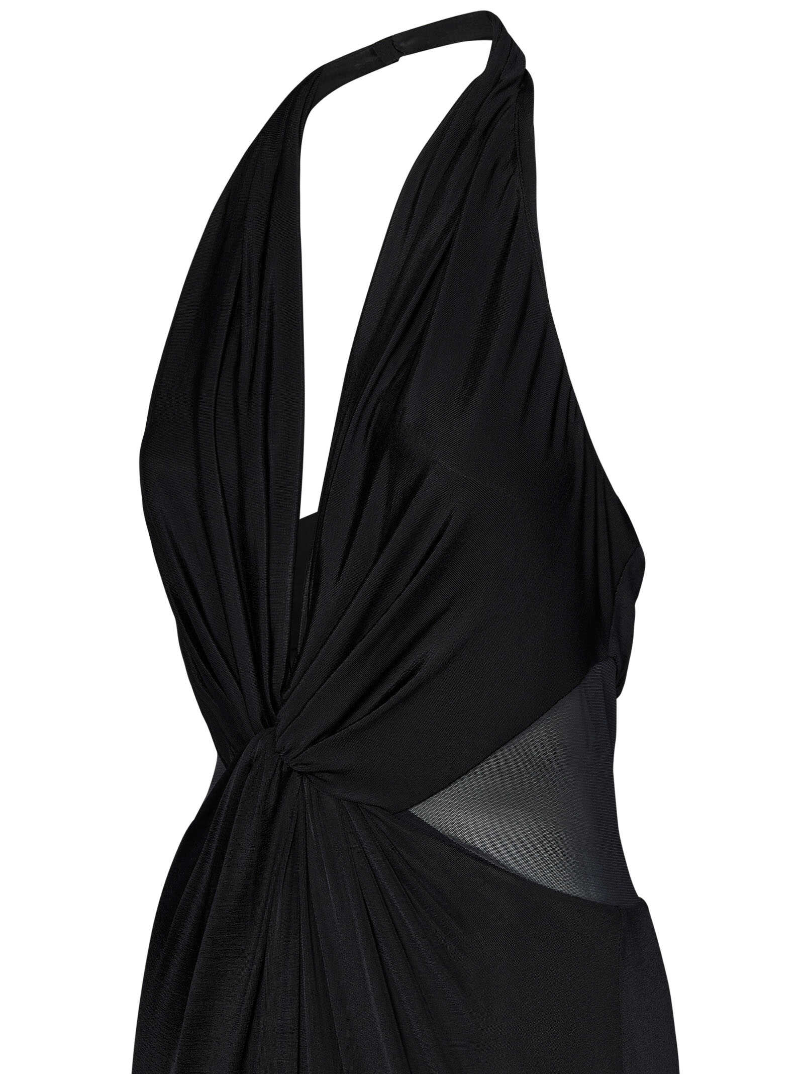 Long dress in black stretch viscose with American neckline and semi-transparent inserts.