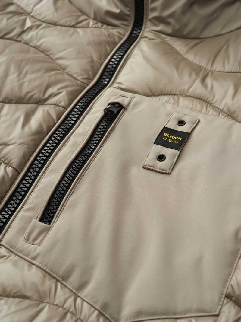 Monochromatic water-repellent down jacket with light and smooth neoprene in tone on the sleeves and shiny nylon body with wave stitching. Mixed padding to keep you warm even in adverse weather conditions. Fixed hood with wave stitching Made of shiny micro rip nylon and neoprene Lined in shiny nylon with matching waves Padded with 50% polyester and 50% feather Zip closure Neck slider cover Zipped pockets Zipped chest pocket Striped elastic on the profile of the hood, cuff and bottom. Internal pockets with velcro Patch and loop with logo