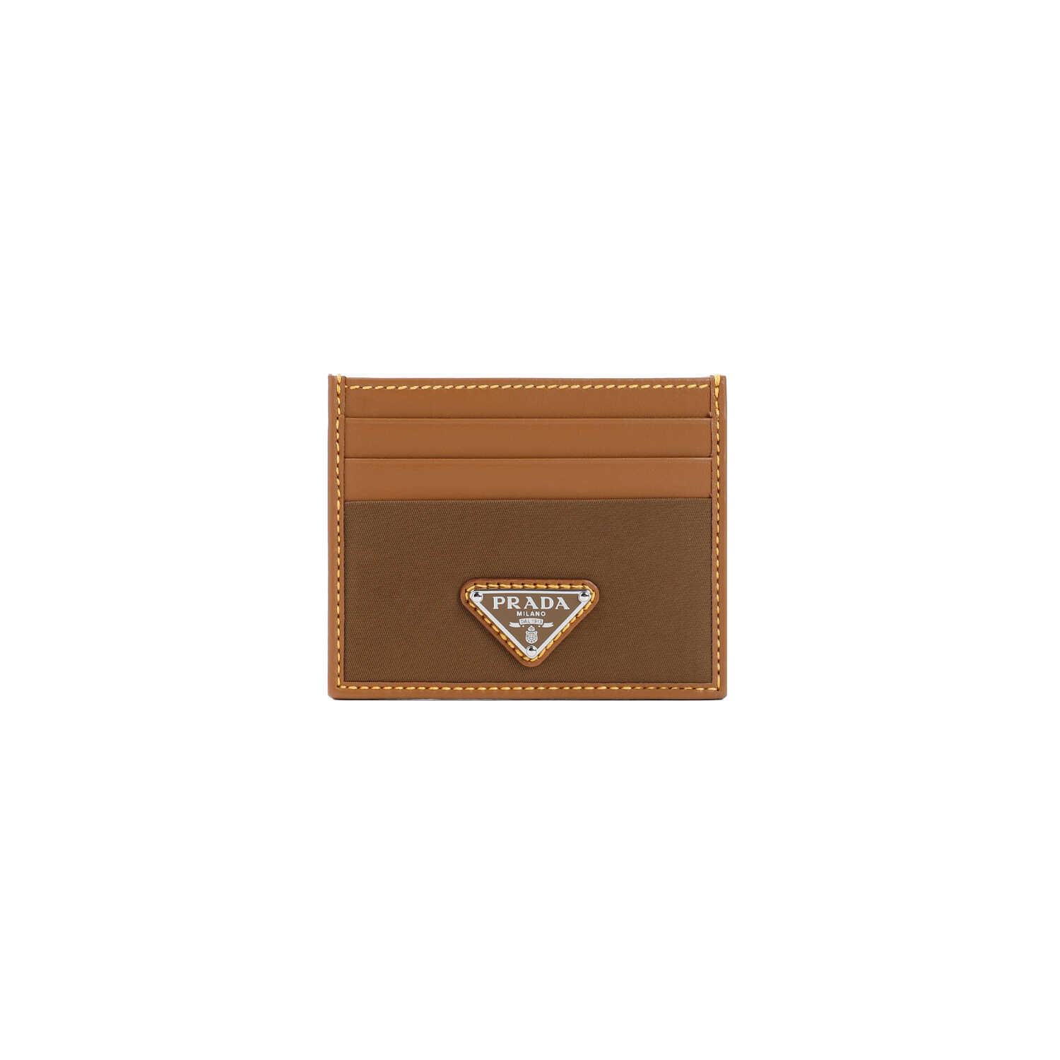 Elevate your style with this luxurious Prada card holder. Crafted from brown re-nylon and calf leather, featuring the iconic enameled triangle logo on the front. With six credit card slots and a convenient extra slot, this accessory combines functionality and elegance seamlessly. Perfect for the modern man on-the-go. Add a touch of sophistication to your everyday essentials with the PRADA 2MC025.2CX2 card holder.