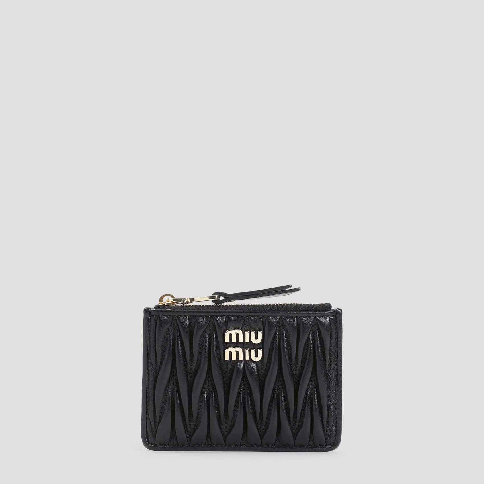 Elevate your accessory game with this luxurious Miu Miu black lamb leather card holder. The sleek design and high-quality construction make it a must-have for any fashion-forward individual. With a top zipped fastening, gold-tone metallic logo, and three convenient card slots, this wallet is both stylish and practical. Add a touch of sophistication to your everyday essentials with this Miu Miu creation.