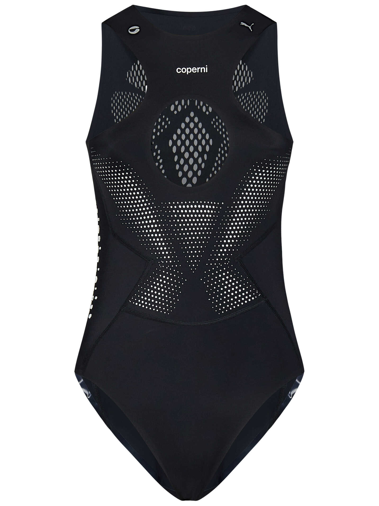 Puma X Coperni black technical fabric sporty bodysuit with cutout and reflective details.