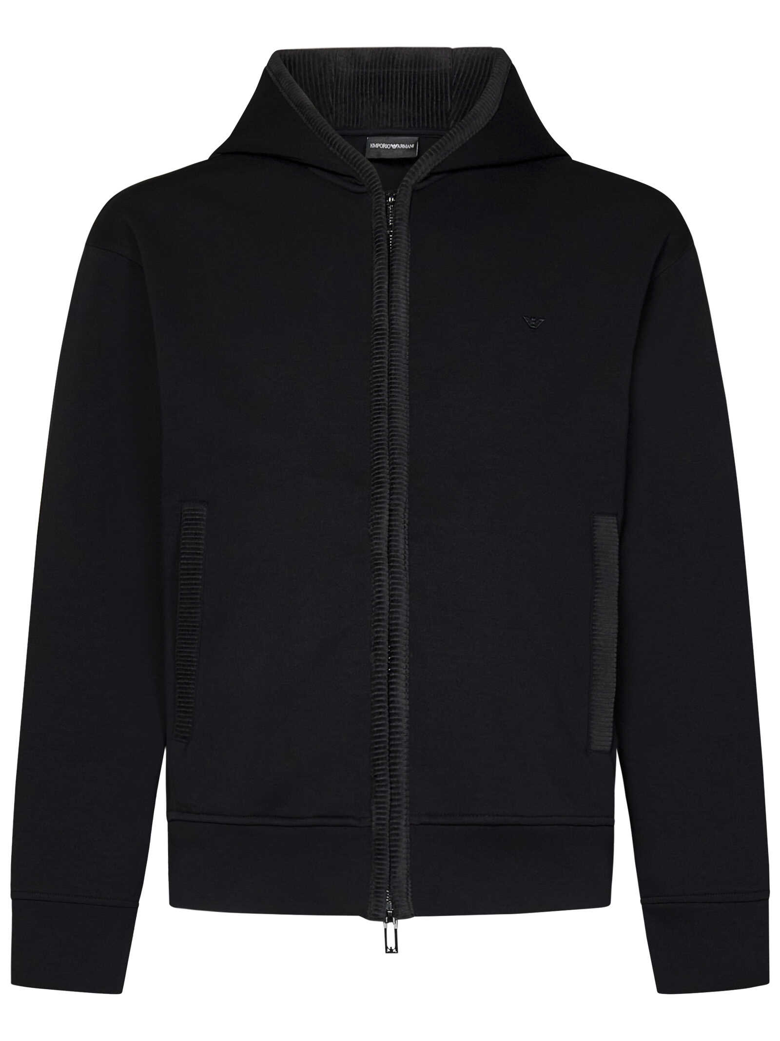 Black cotton blend zip-up hoodie with corduroy trim and logo on the chest.