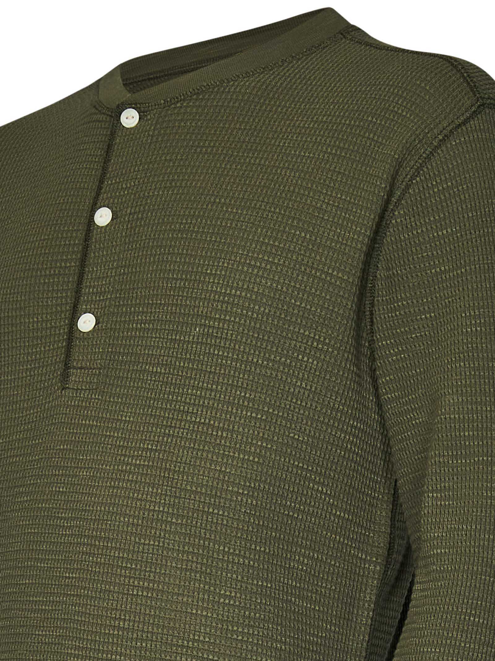 Olive green garment-dyed waffle-knit cotton long-sleeved henley shirt.
