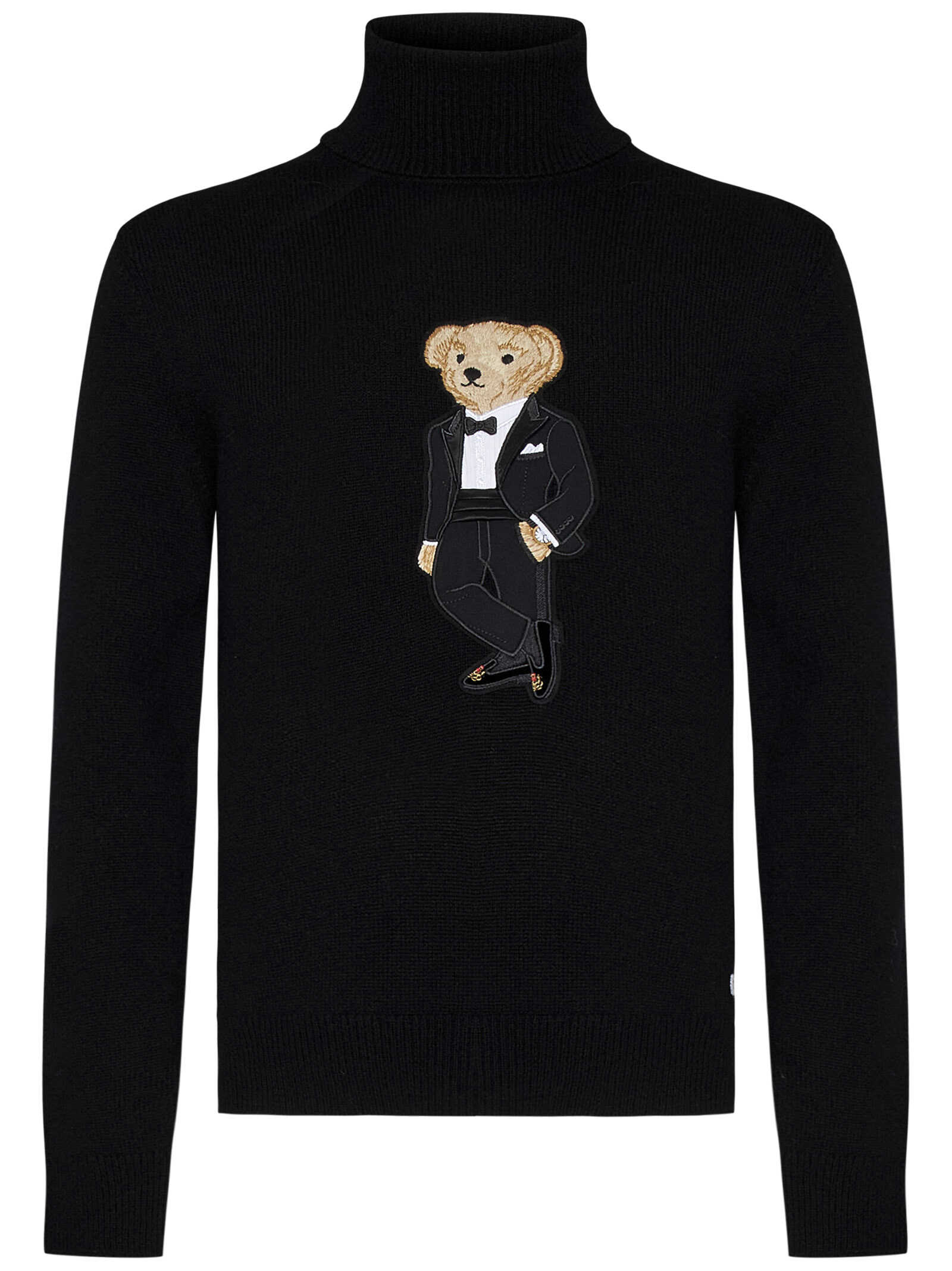 Polo Bear black cashmere turtleneck sweater with Polo Bear patch at front.