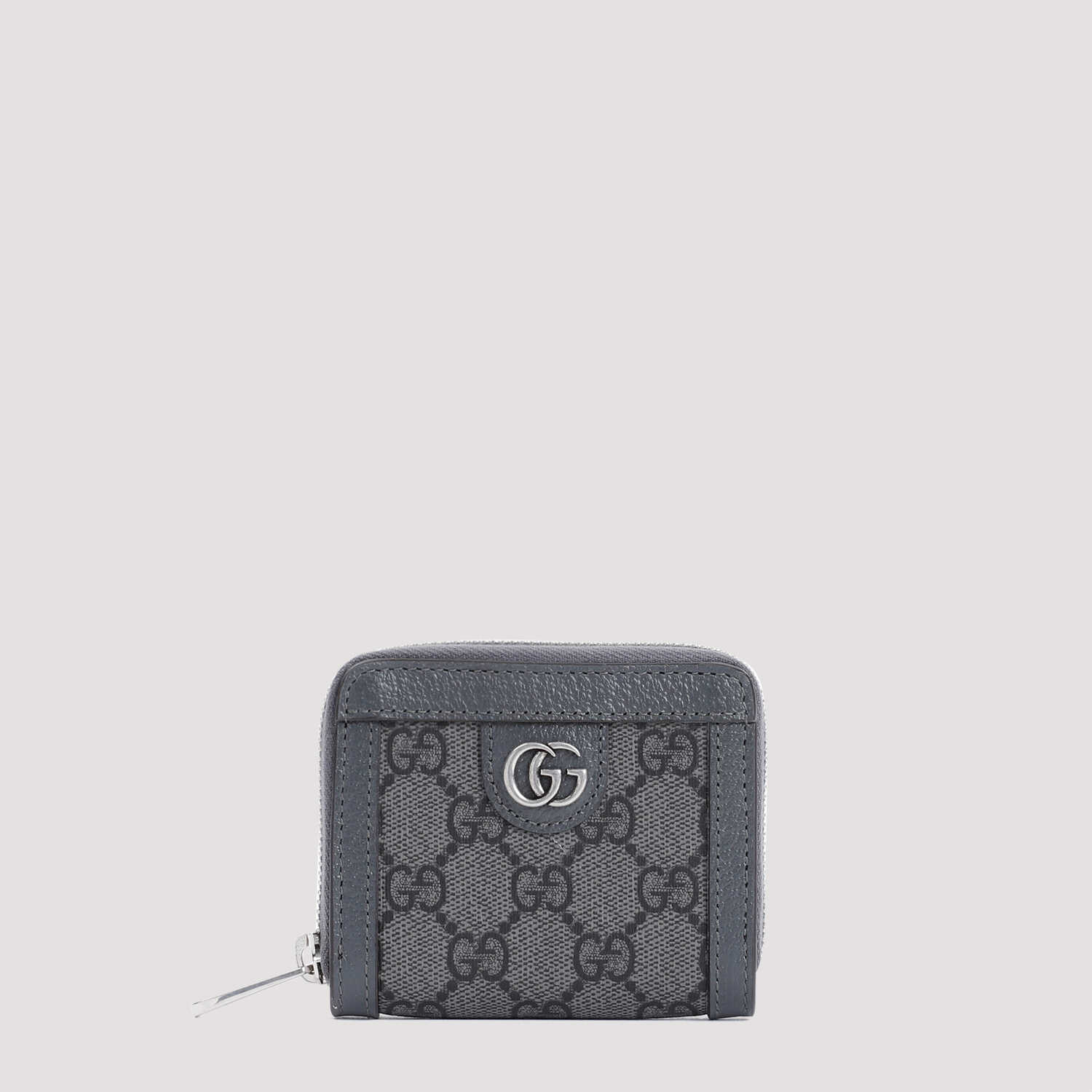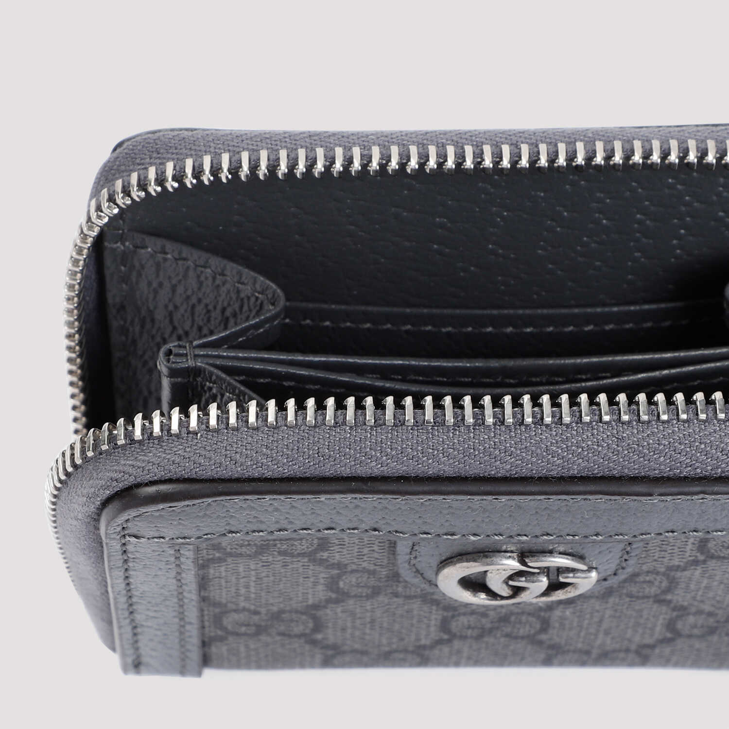 Elevate your style with this sophisticated GUCCI wallet. Crafted with grey and black GG Supreme canvas and accented with luxurious leather trims. Features a zip closure, five card slots, and silver-toned hardware. Perfect for the modern man on-the-go. Add a touch of elegance to your everyday essentials.