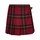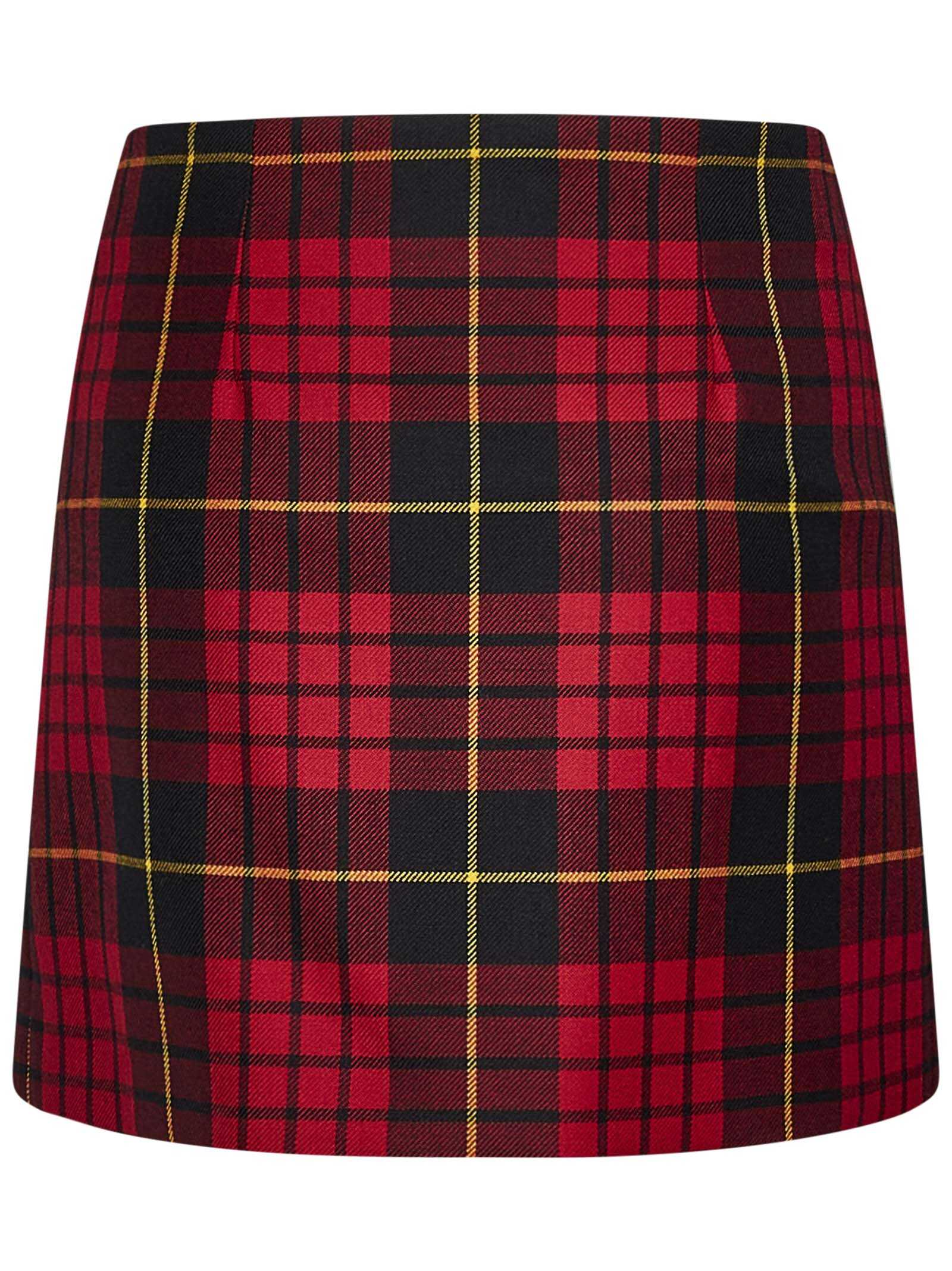 Pleated red and black and yellow tartan wool mini skirt with golden metal pin.
