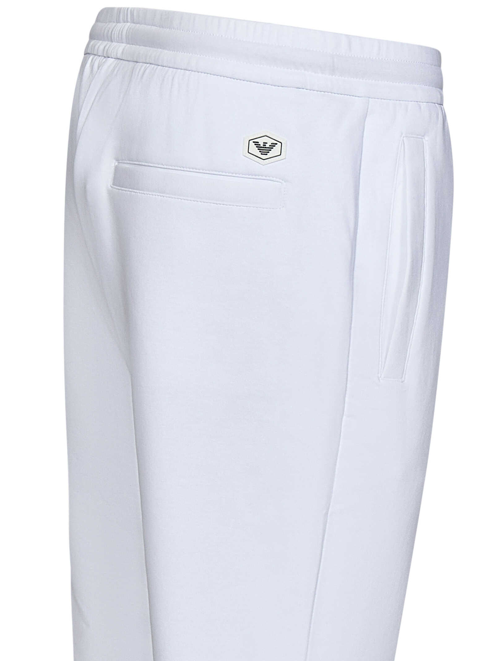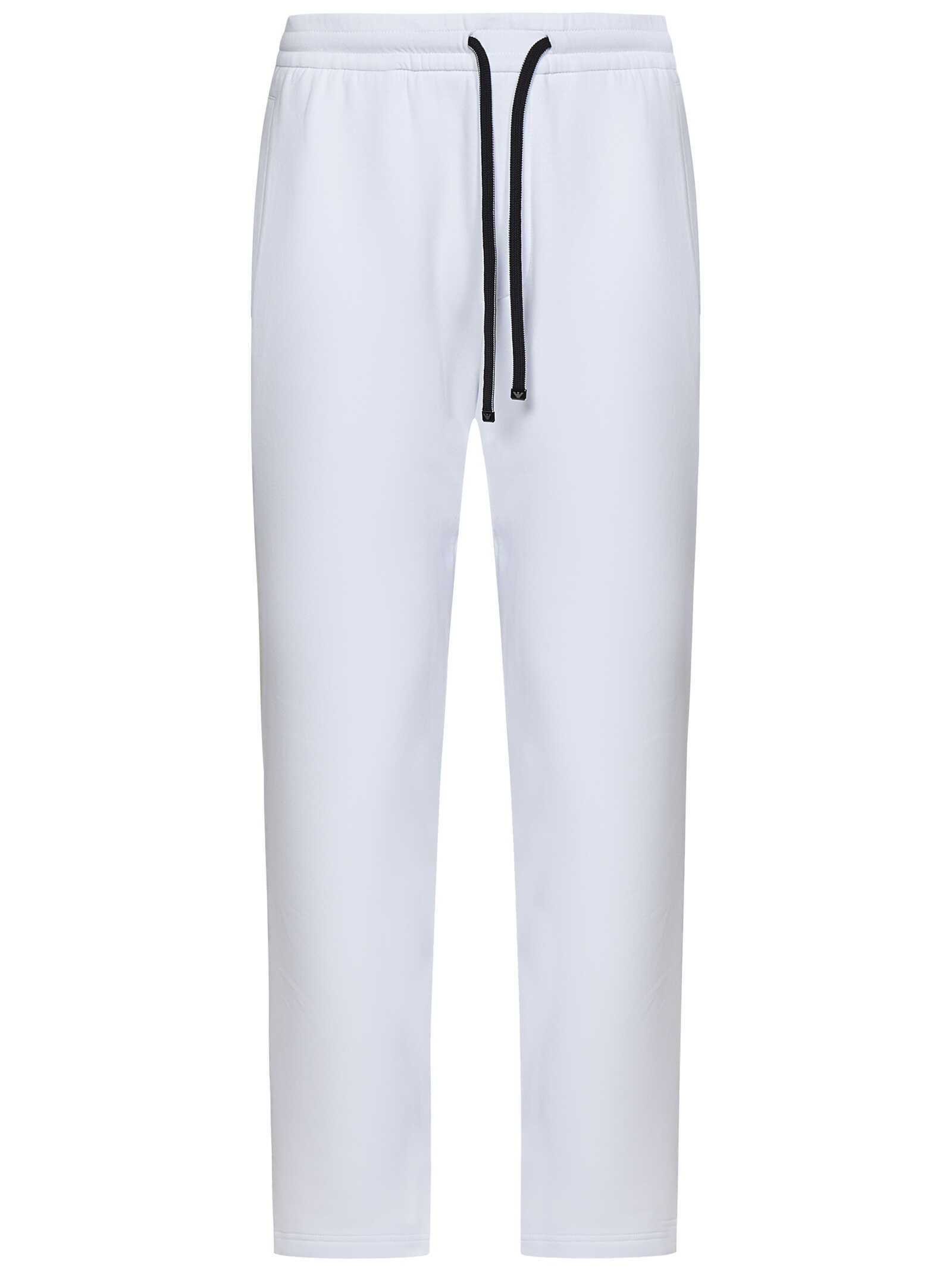 White cotton blend double jersey jogger trousers with drawstring waist and logo patch.