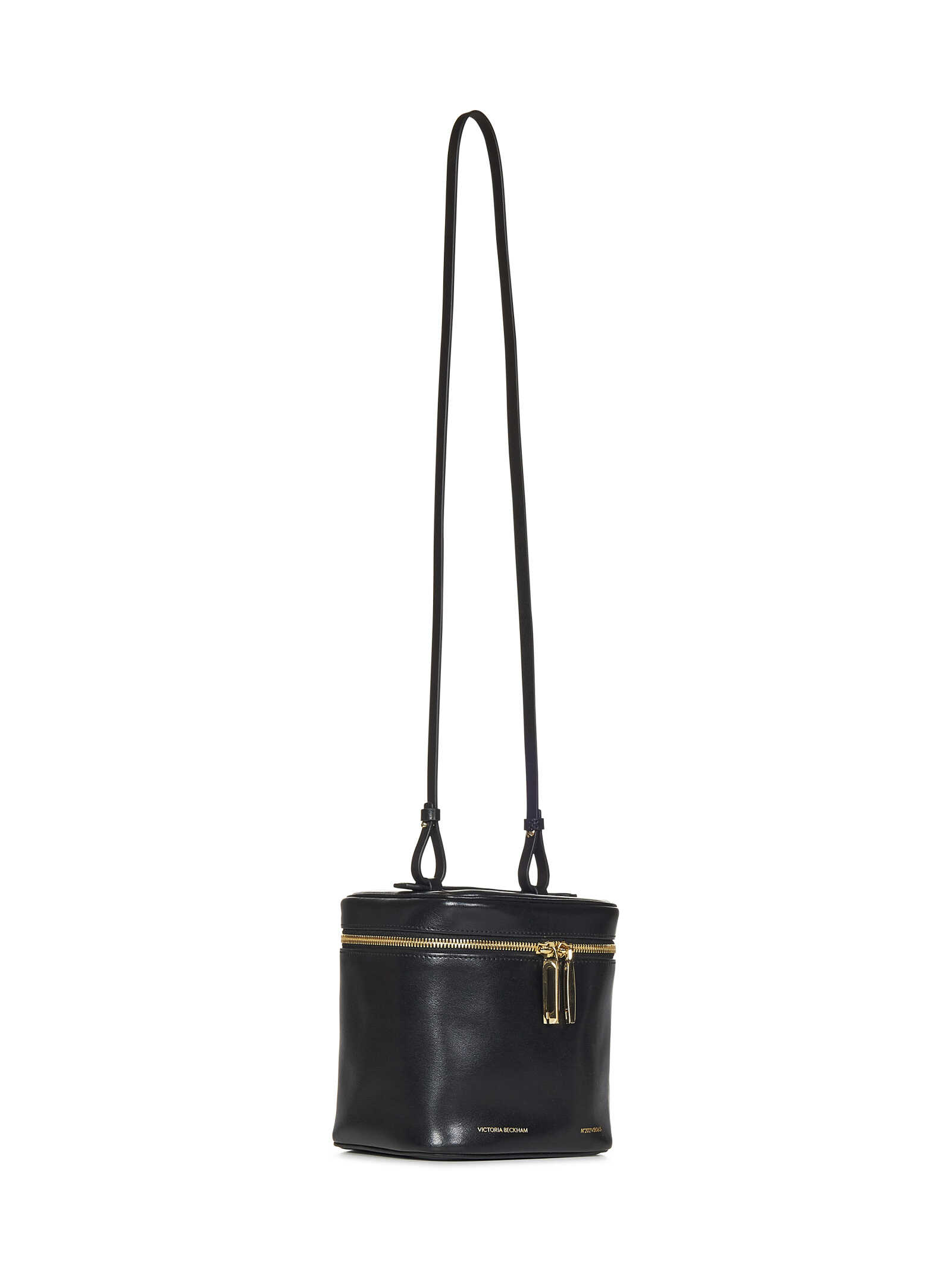 Vanity Cube shoulder bag in black leather with removable shoulder strap and gold logo print on the front.