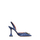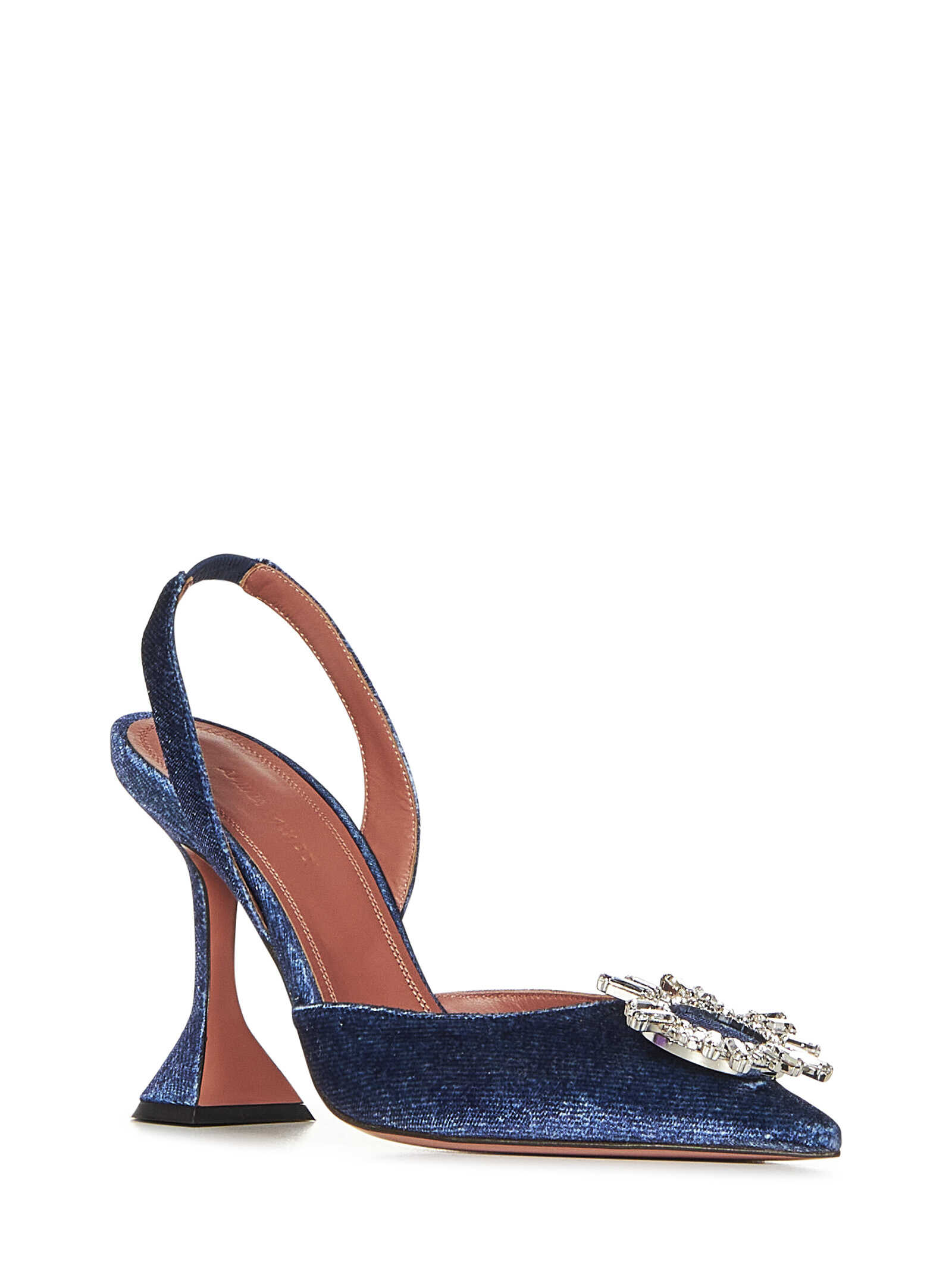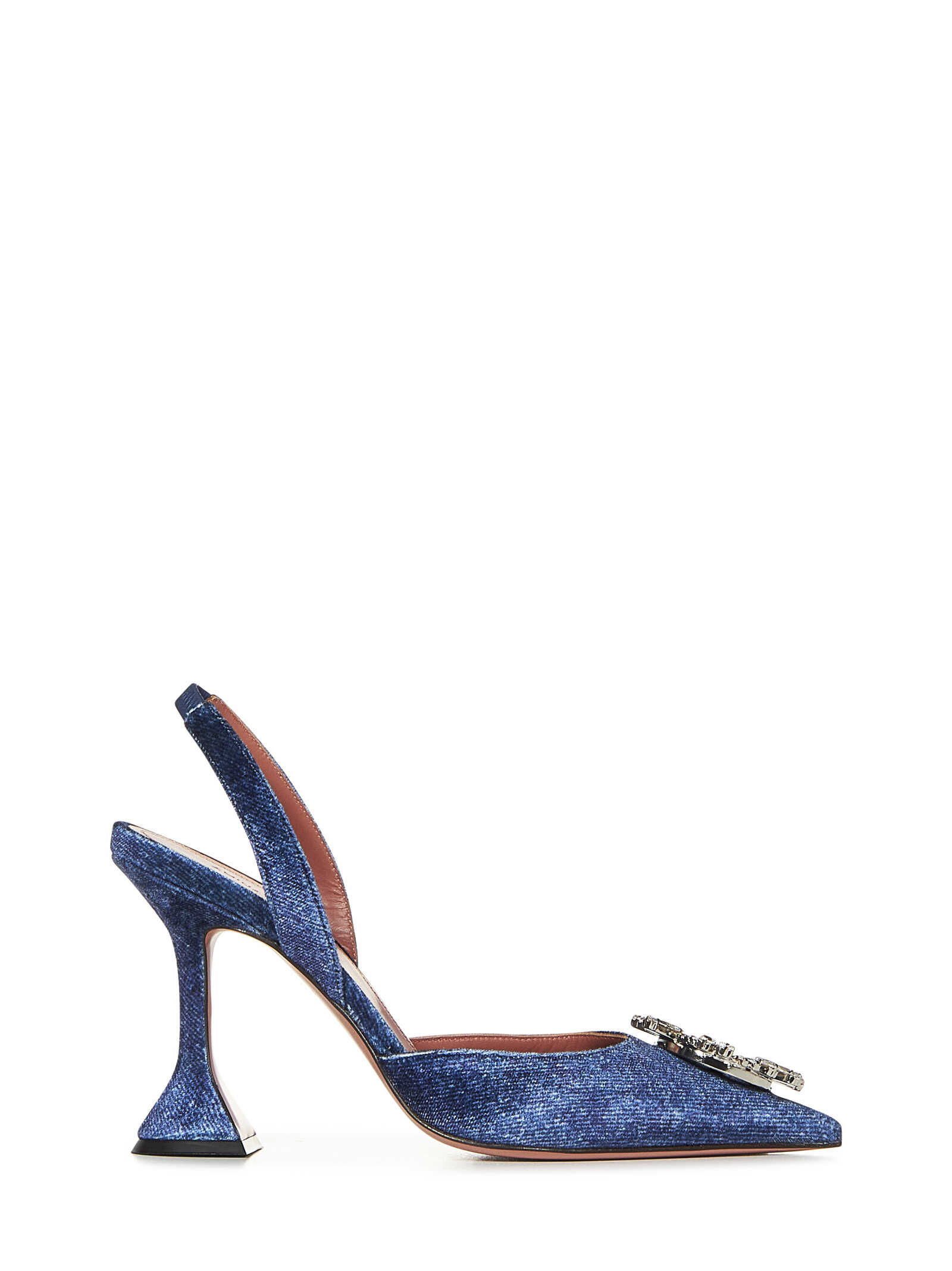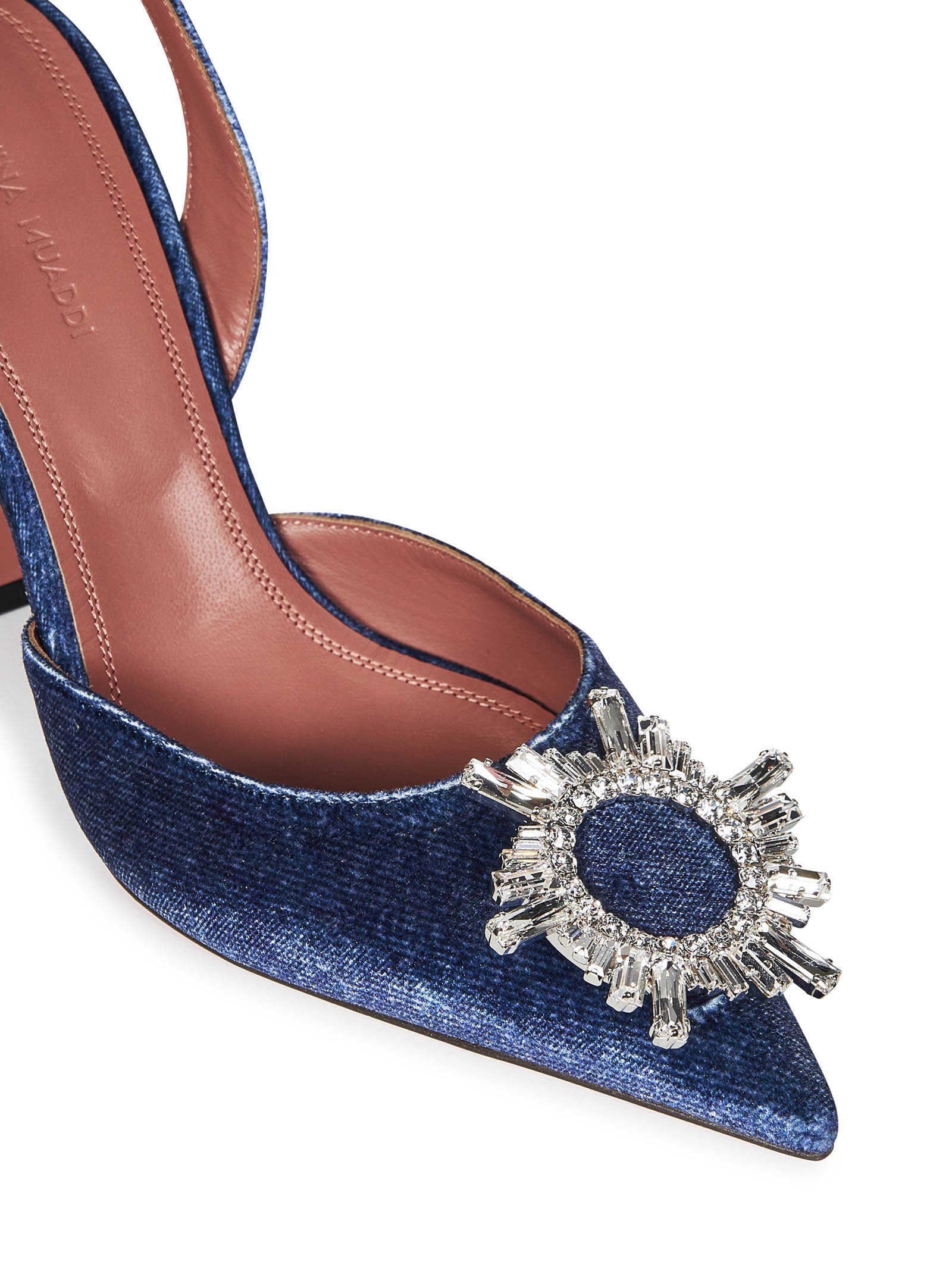 Begum Sling denim slingback with crystal-embellished brooch and hourglass heel.