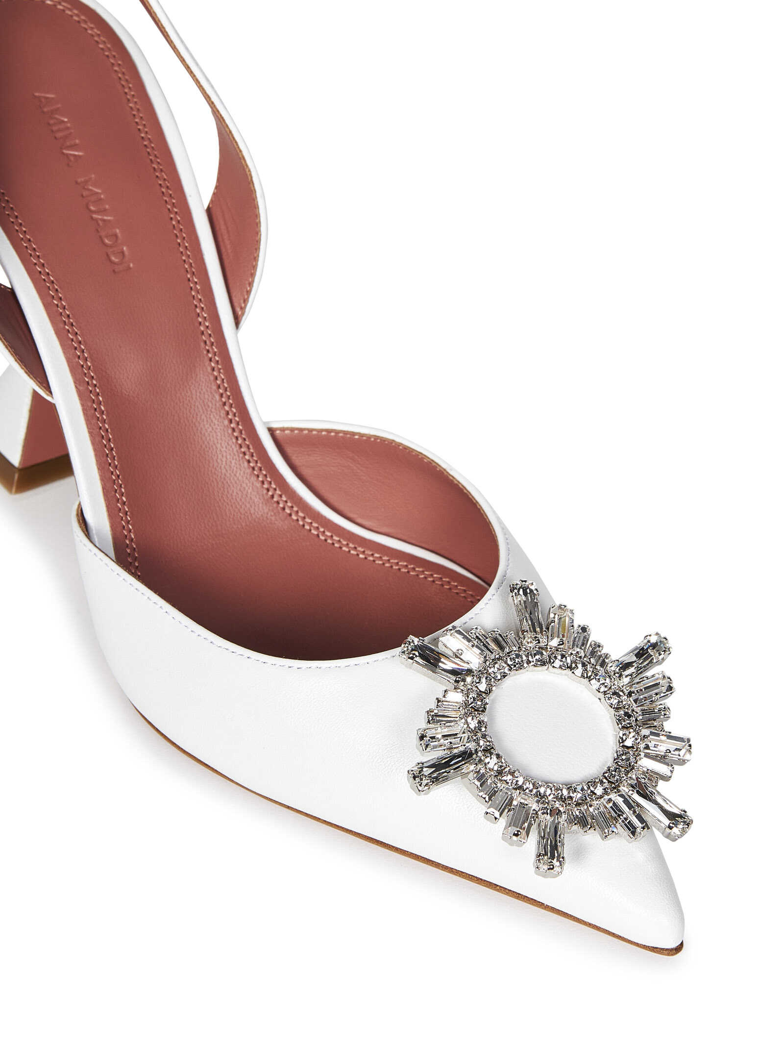Begum Sling white nappa slingback with crystal-embellished brooch and hourglass heel.