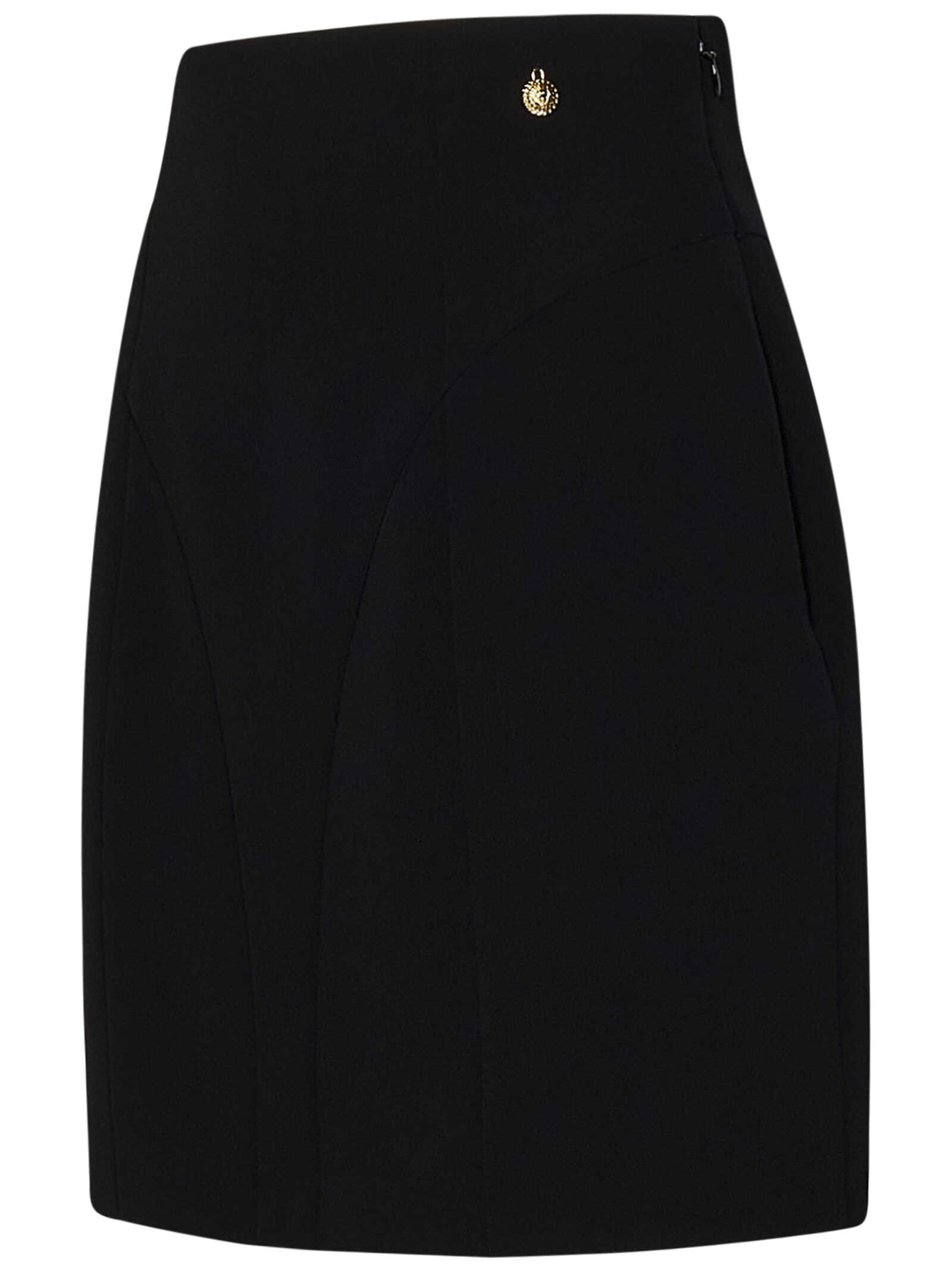 High-waisted black viscose crepe tulip miniskirt with golden metal medal.