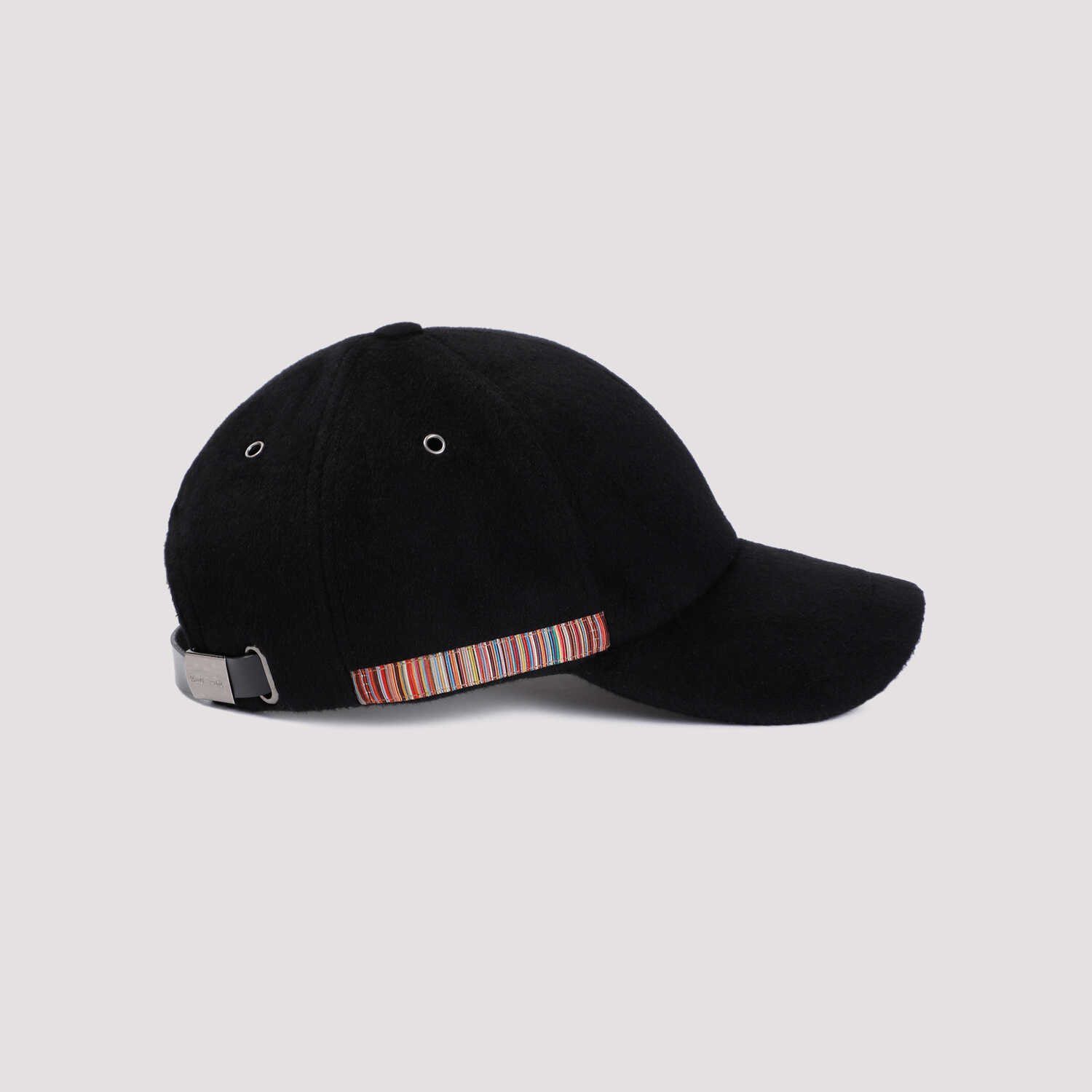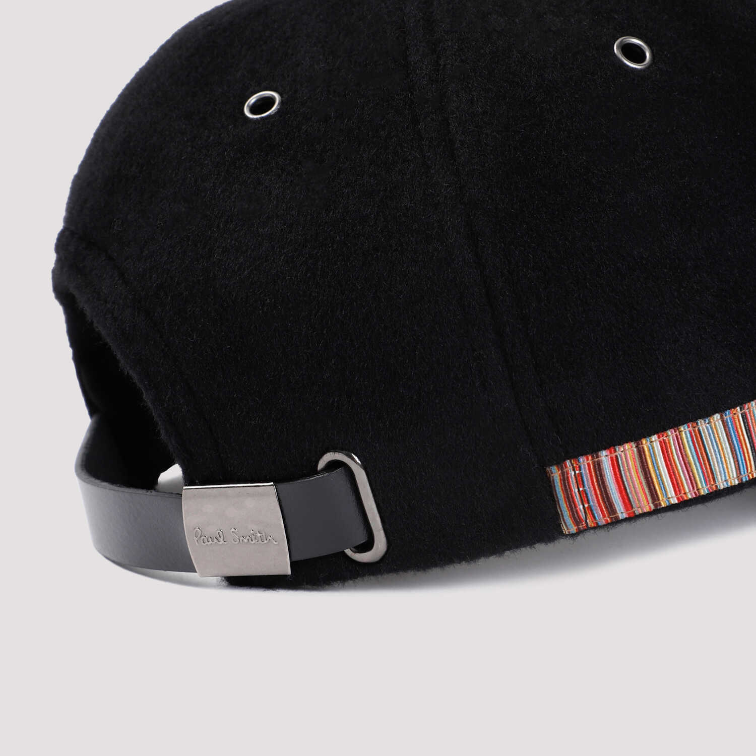 Elevate your style with the PAUL SMITH M1A987D.TN086 black wool cap. This baseball cap features silver-tone eyelets, signature multicolor stripes on the sides, and a leather strap with adjustable buckle for a perfect fit. Made from 100% wool, this cap is a must-have accessory for men who appreciate quality and style.