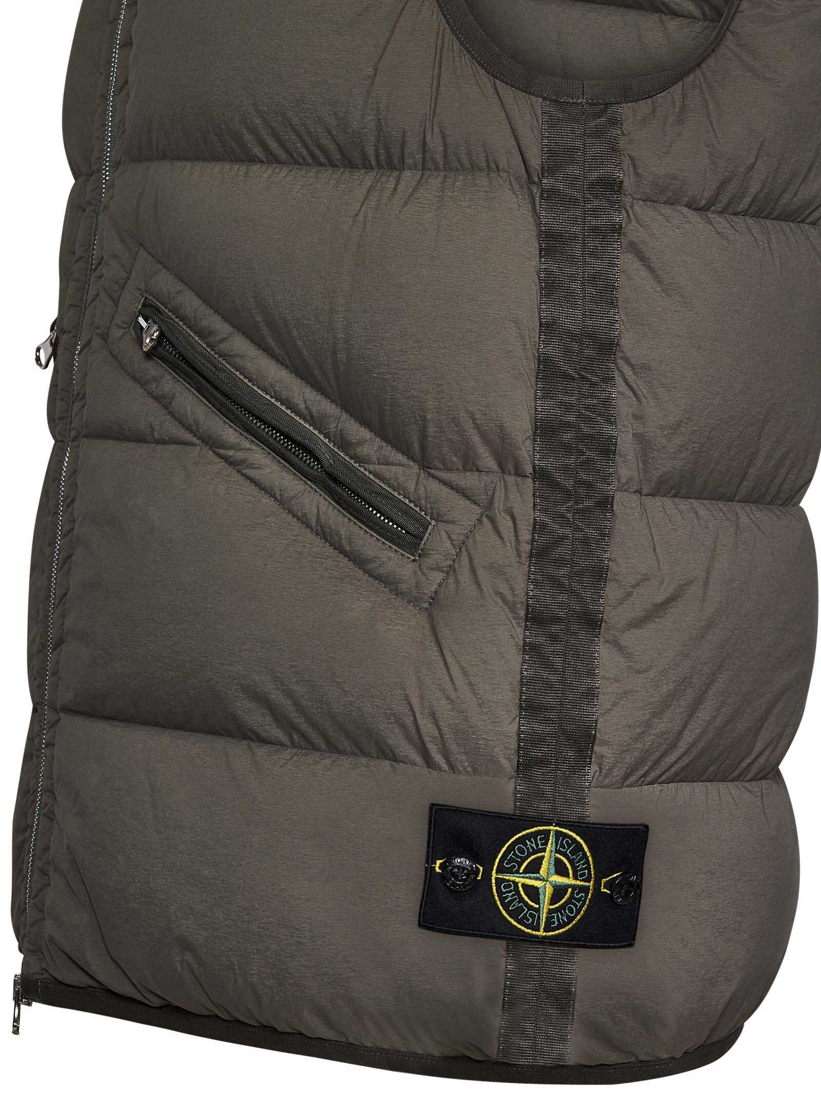 Light brown lightweight stretch nylon vest with seamless down tunnels and logo badge.